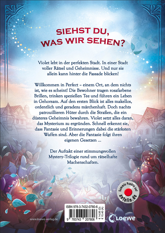 Willkommen in Perfect - einem Ort, an dem nichts ist, wie es scheint! Die Bewohner tragen rosafarbene Brillen, trinken speziellen Tee und führen ein Leben in Gehorsam. Auf den ersten Blick ist alles makellos, ordentlich und geradezu märchenhaft. Doch nachts patrouillieren Hüter durch die Straßen, die ein düsteres Geheimnis bewahren. Violet setzt alles daran, das Mysterium zu ergründen. Schnell erkennt sie, dass Fantasie und Erinnerungen dabei die stärksten Waffen sind. Aber die Fantasie folgt ihren eigenen Gesetzen ...