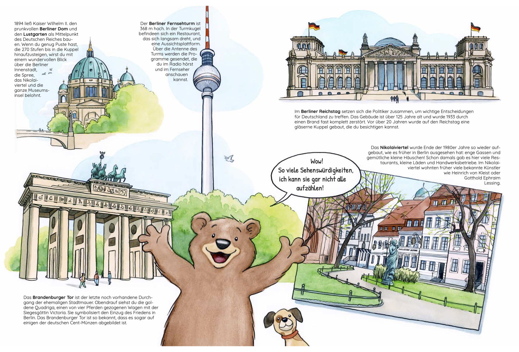 Diese und viele andere Fragen beantworten das Kinderbuch "Unser Berlin". Hier gibt es viel Interessantes, Wissenswertes und Kurioses über die Stadt und ihre Geschichte zu entde-cken. Im originalen Berliner Dialekt stellt sich gleich zu Beginn des Familienreiseführers das Wappentier Berlins vor: "Hallo, ick bin Berlo, 'n Berlina Bär". Als Stadtführer begleitet er die Leser durch die Kapitel und erklärt die Highlights der deutschen Hauptstadt.