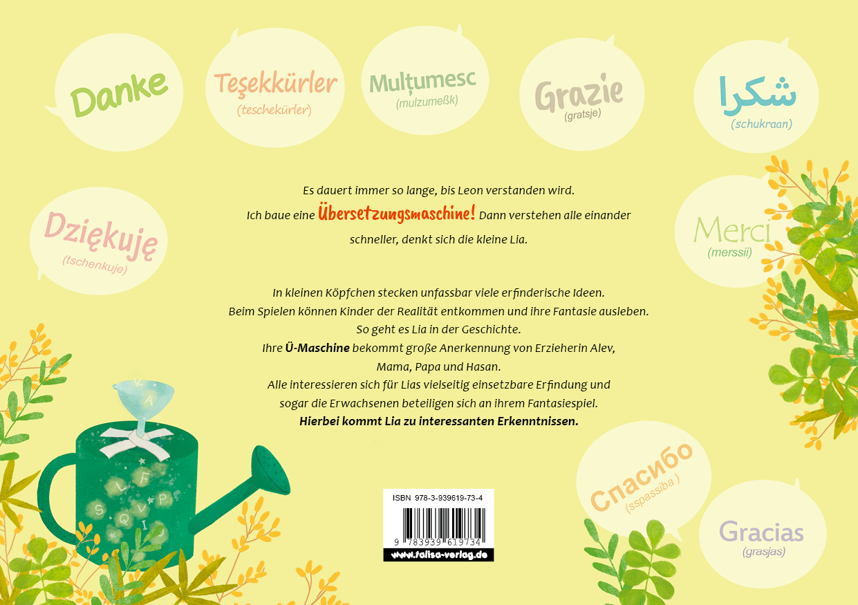 Es dauert immer so lange, bis Leon verstanden wird. Ich baue eine Übersetzungsmaschine! Dann verstehen alle einander schneller, denkt sich die kleine Lia.Ihre Ü-Maschine bekommt große Anerkennung von Erzieherin Alev, Mama, Papa und dem Gemüsehändler Hasan. Alle interessieren sich für Lias vielseitig einsetzbare Erfindung und sogar die Erwachsenen beteiligen sich an ihrem Fantasiespiel. Hierbei kommt Lia zu interessanten Erkenntnissen.Sprachen: Deutsch, Arabisch, Französisch, Italienisch, Polnisch, Rumänisch, Russisch, Spanisch, Türkisch.