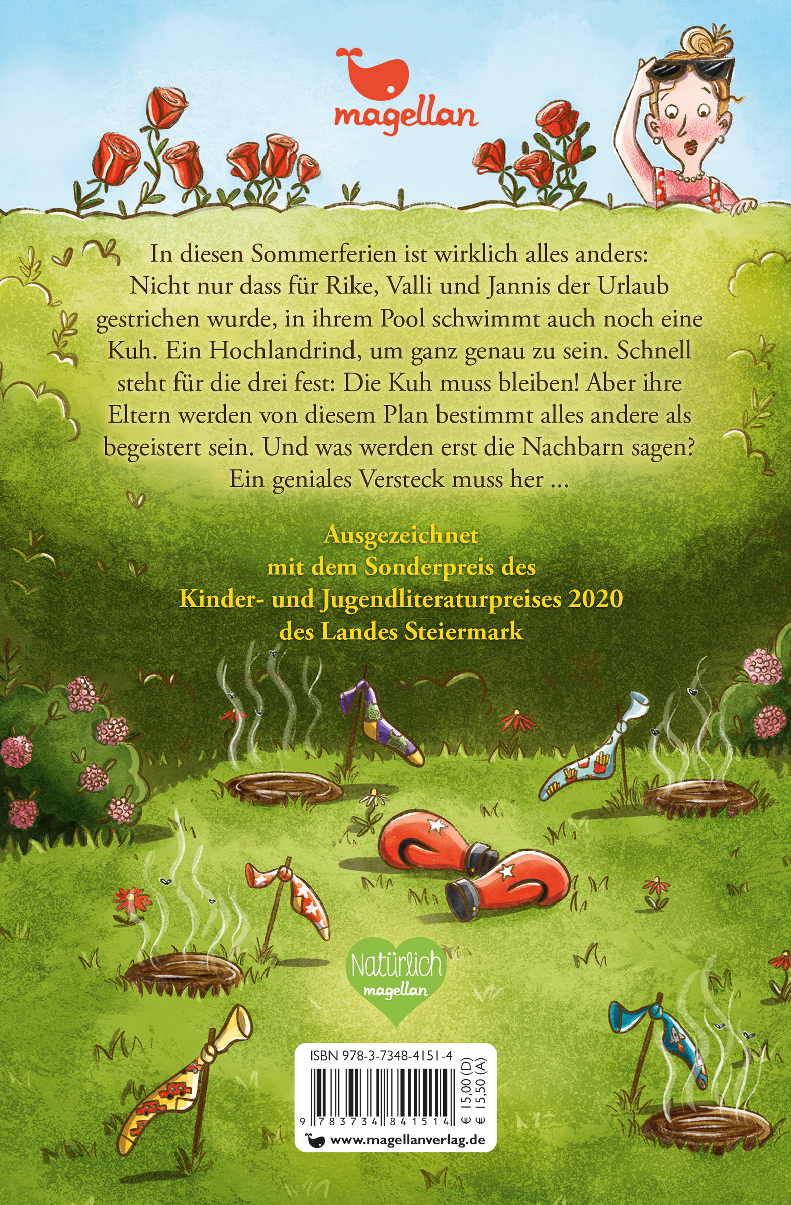 In diesen Sommerferien ist wirklich alles anders: Nicht nur dass für Rike, Valli und Jannis der Urlaub gestrichen wurde, in ihrem Pool schwimmt auch noch eine Kuh. Ein Hochlandrind, um ganz genau zu sein. Schnell steht für die drei fest: Die Kuh muss bleiben! Aber ihre Eltern werden von diesem Plan bestimmt alles andere als begeistert sein. Und was werden erst die Nachbarn sagen? Ein geniales Versteck muss her …