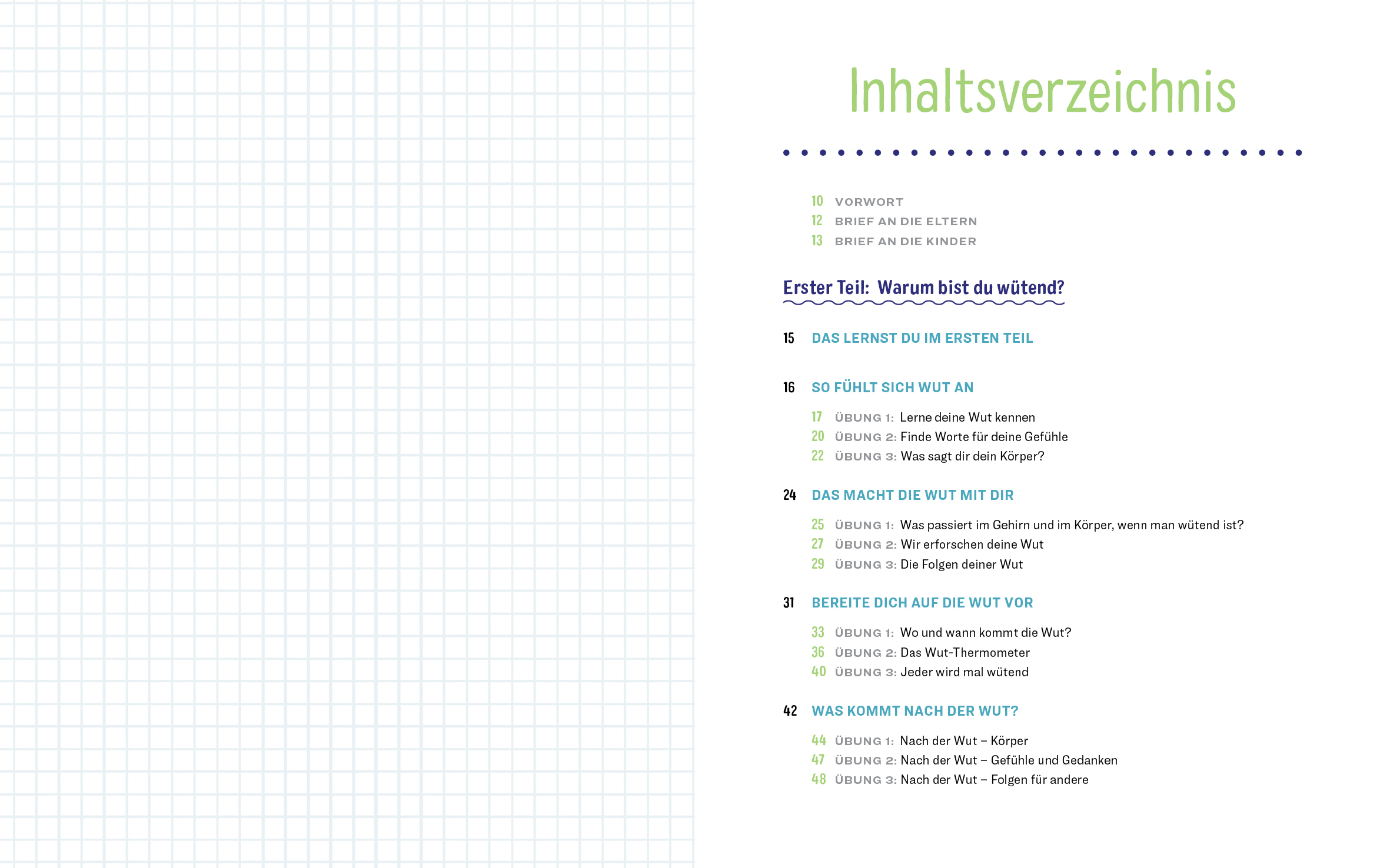 Wer Kindern frühzeitig beibringt, wie sie auf Wut reagieren sollen, vermittelt ihnen die lebenslange Fähigkeit, mit starken Emotionen umzugehen, ruhig zu bleiben und vernünftige Verhaltensentscheidungen zu treffen. Dieses Mitmachbuch für Kinder ab sieben Jahren enthält 50 spielerische Übungen zur Wutbewältigung. Durch Knobeln, Schreiben, Meditieren und Basteln lernen die Kinder, das Gefühl der Wut zu erkennen und in den Griff zu bekommen. Sie erfahren, wie sie in jeder Situation freundlich zu sich selbst und anderen bleiben und durch Dankbarkeit, Gelassenheit und Selbstliebe positiv mit Ärger umgehen können.