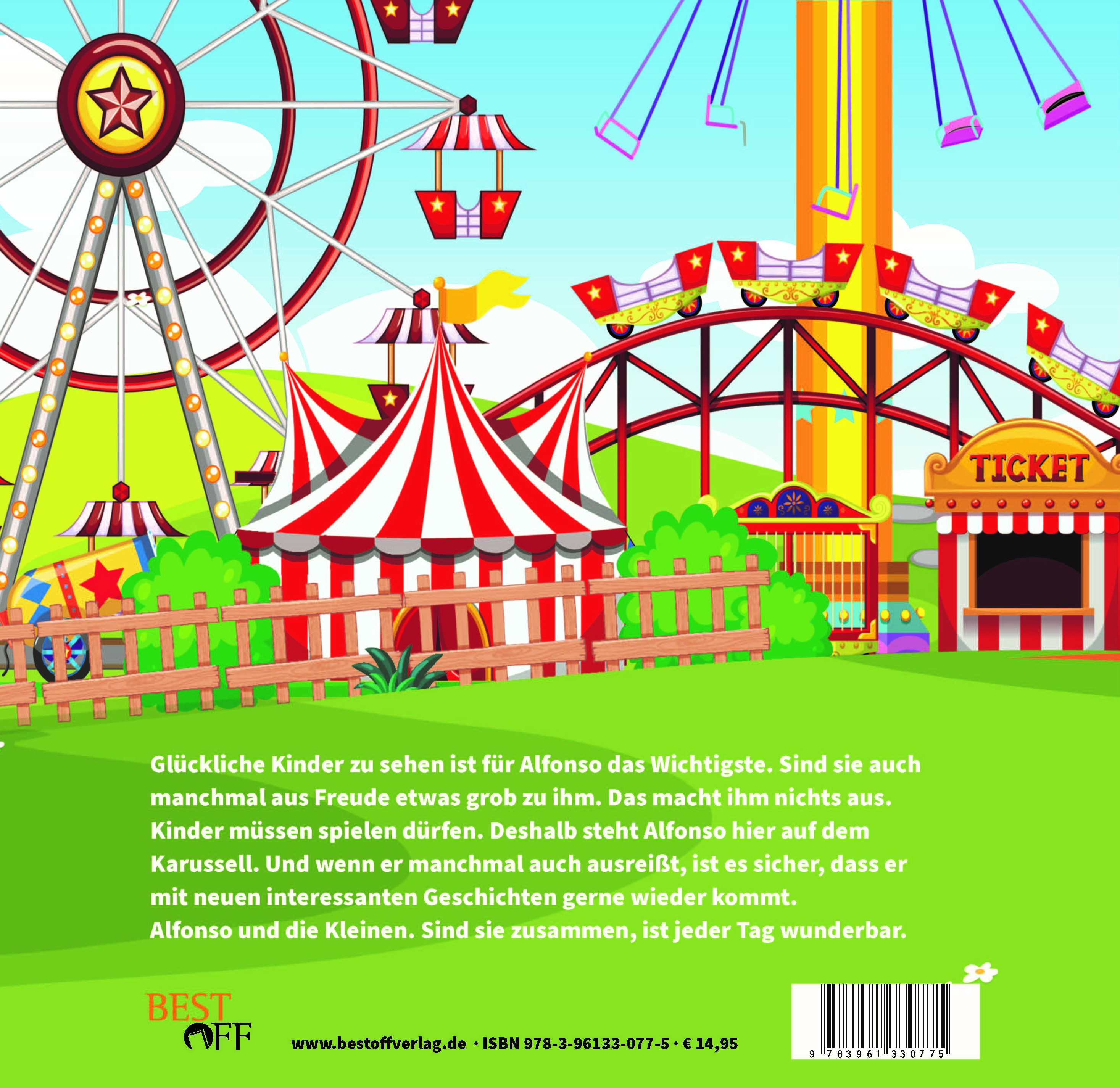 Glückliche Kinder zu sehen ist für Alfonso das Wichtigste. Sind sie auch manchmal aus Freude etwas grob zu ihm. Das macht ihm nichts aus. Kinder müssen spielen dürfen. Deshalb steht Alfonso hier auf dem Karussell. Und wenn er manchmal auch ausreißt, ist es sicher, dass er mit neuen interessanten Geschichten gerne wieder kommt. Alfonso und die Kleinen, sind sie zusammen, ist jeder Tag wunderbar. Die Abenteuerreise geht weiter, Weitere Geschichten in Band 2.