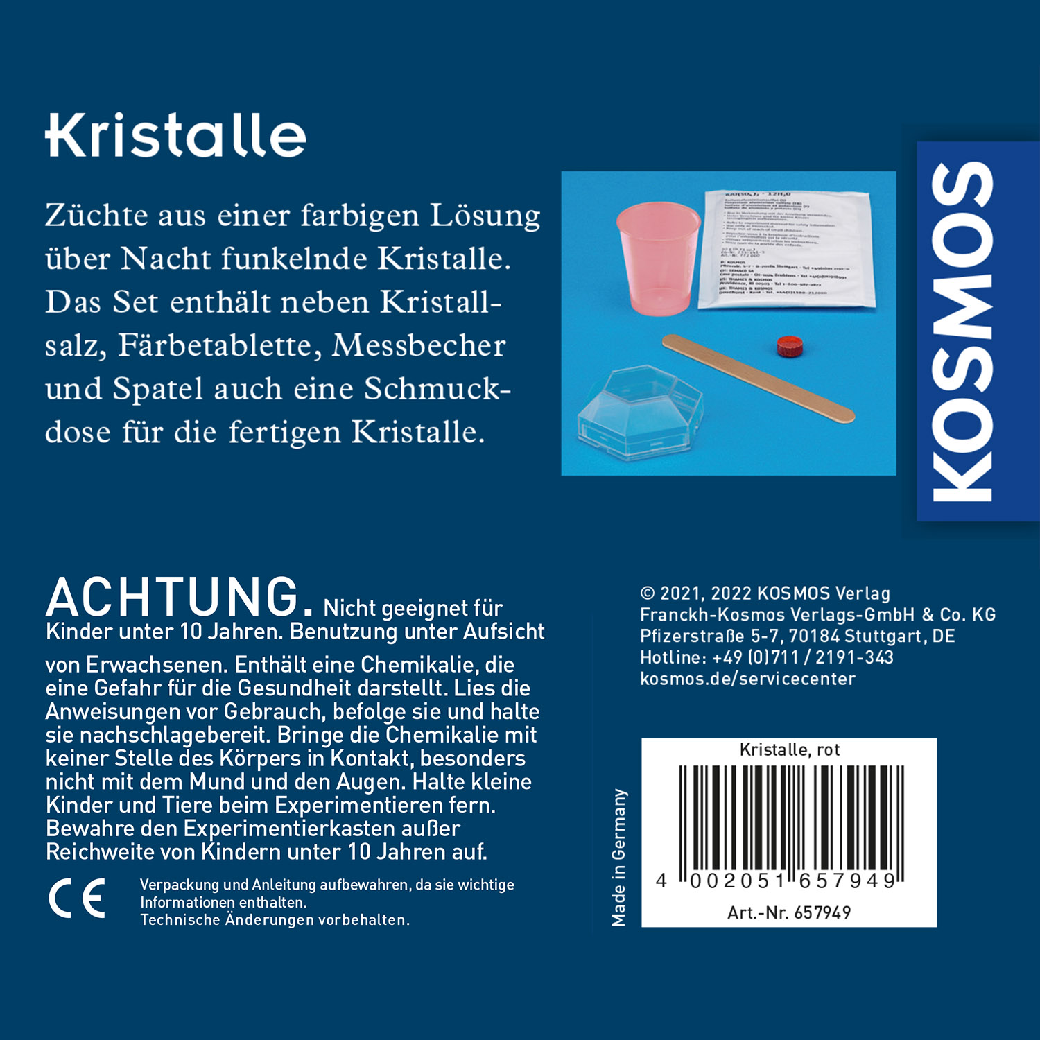 Spannende Experimente erleben - funkelnde rote Kristalle selber züchten. Schnelle Ergebnisse garantieren Forscher-Spaß: Kristallwachstum über Nacht. Komplette Ausstattung zum Züchten inkl. kleiner Schmuckdose zum Aufbewahren und Präsentieren der Kristalle. Experimente mit Lösungen - Kinder entdecken spielerisch Chemie. KOSMOS Experimentierkasten für Kinder ab 10 Jahren. Aus Kristallsalz und rotem Farbstoff wird in diesem KOSMOS Experimentier-Set über Nacht ein funkelnder Kristall gezüchtet. Das Wunderwerk der Natur kann anschließend in einer kleinen Schmuckdose ausgestellt werden. Auf spielerische Weise experimentieren Kinder beim Züchten mit unterschiedlichen Lösungen und entdecken so erste Aspekte der Chemie. In der leicht verständlichen farbigen Anleitung wird Schritt für Schritt erklärt, wie die Kristalle gezüchtet werden. Ab 10 Jahren.