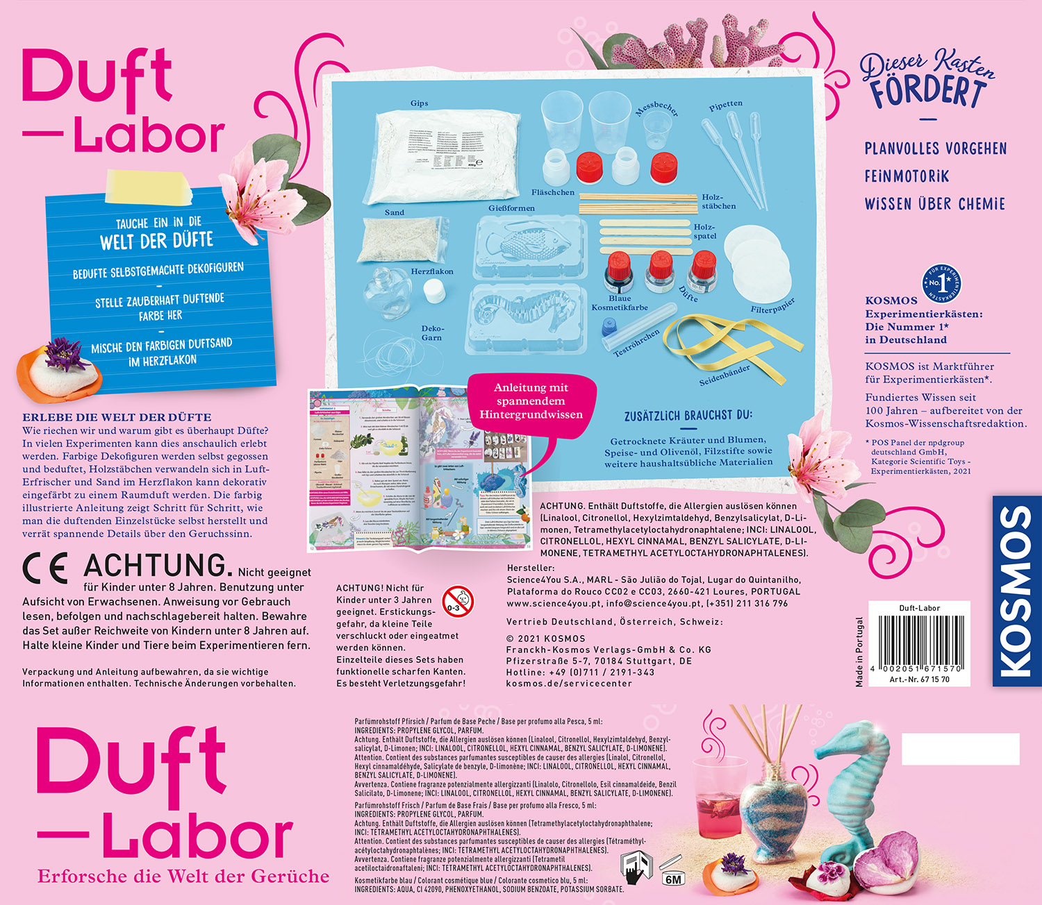 Aroma-Sand und toll riechende Luft-Erfrischer - aus zwei Düften entstehen Produkte, über die sich die Nase freut. Duft-Gel oder wohlriechende Duftsteine: tolle und ungewöhnliche Duft-Kombinationen warten darauf, entdeckt zu werden. Ein besonderer Hingucker ist der Herz-Flakon, in dem duftender Sand in unterschiedlichen Farben geschichtet wird und sein tolles Aroma verströmt. Die Anleitung führt mit tollen Experimenten und Bildern in die Welt des Geruchssinns ein und liefert viele Wissenstexte. Der KOSMOS Experimentierkasten macht das eigene Kinderzimmer zum Duft-Labor. Für Kinder von 8 bis 12 Jahren. Ein zauberhafter Einstieg in die Welt der Gerüche. Mit diesem Labor werden zarte Düfte in verschiedensten Formen verarbeitet: Duftende Farbe und mit Blüten und Gewürzen verzierte Duftsteine. Bald riechen nicht nur Kinderzimmer und Bad wohltuend, sondern auch selbst gemachte Lesezeichen und farbige Blumen aus Filterpapier. Besonderes Extra: bunt geschichteter, duftender Sand in einer wunderschöner Herzflasche. Dazu verrät die Anleitung des KOSMOS Experimentiersets, wie der Geruchssinn des Menschen funktioniert, wie Pflanzen Duft-Aromen produzieren und weitere spannende Fakten rund um das Thema Parfum und Geruch. Eine spannende Reise in die Welt der Aromen für Kinder von 8 bis 12 Jahren.