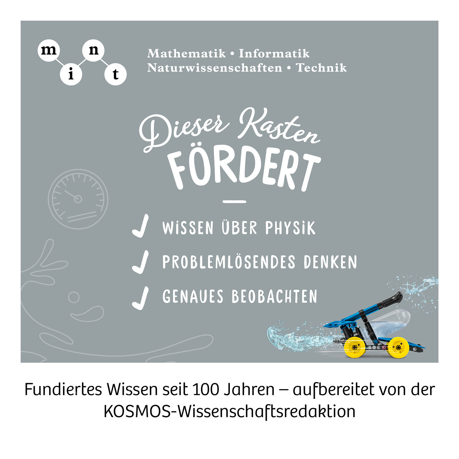 Mit Wasserkraft sechs Modelle antreiben: Von der Wasserpistole über Autos zu Booten, jetzt wird es nass! Die Bauteile einfach zusammensetzen und dabei die Druckluftpumpe nicht vergessen! Die sorgt nämlich für den fantastischen Raketenantrieb der Modelle. Ob Wasserpistolen-Duell oder flitzendes Boot in der Badewanne: Mit dem Wasser-Antrieb wird spielerisch experimentiert und die Ergebnisse im Anleitungsheft festgehalten. Neben den vielen Bildern zum Aufbau und zu den Versuchen liefert die Anleitung aufschlussreiche Hintergrundinfos zur Druckluft und dem Rückstoß-Prinzip. Ein KOSMOS Experimentierkasten für Kinder von 8 bis 12 Jahren, die beim spielerischen Umgang mit Wasser fast schon zu angehenden Raketenwissenschaftlern werden. Wasser Marsch! Aus den Steckteilen entstehen 6 coole Modelle, die alle mit Wasser vollgetankt werden - und schon geht's ab! Weitschuss-Wettbewerb mit der Wasserpistole, lustige Spiele mit dem Sprinkler und zwei Autos und Boote sorgen für eine Menge Spielspaß mit Wasser für Kinder von 8 bis 12 Jahren. Der Kern des Ganzen: die besondere Druckluftpumpe, die für jedes Modell als einzigartiger Raketenantrieb dient. Doch wie wirken Wasserkraft und Druckluft zusammen? Mit spannenden Experimenten werden die Modelle getestet. Herausgefunden, wie viele Pumpstöße es für den längsten Schuss mit der Wasserpistole braucht? Schnell in der ausführlichen Anleitung notieren. Ob im Sommer oder in der Badewanne - Wasser macht zu jeder Jahreszeit Spaß!