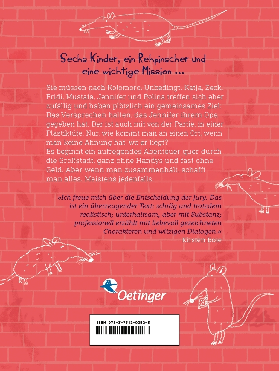 | Schlagworte | Abenteuer • Alltagshelden • AndereKulturen • Antolin (5. Klasse) • Außenseiter • Bande • Beschäftigung für Kinder • Boie Preisträger • Clique • Coming of Age • Diversität • Erwachsenwerden • Freundschaft • Geschenk für Kinder • Großstadt • Großstadtabenteuer • Großstadtsetting • Homosexualität • Kinderbande • Kinderbeschäftigung • Lesen • Magie • Preisgekrönt • Regenbogenfamilie • Reise • starke Kinder • Trost • Urban |