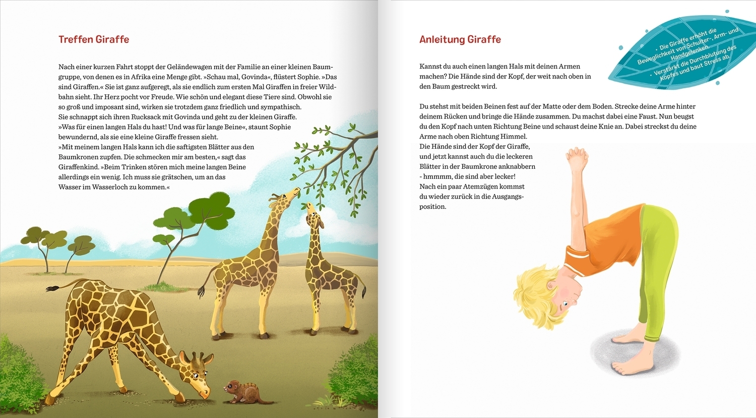 Das neugierige Erdmännchen Govinda nimmt kleine und große Kinder an die Hand und entdeckt mit ihnen die Tierwelt Afrikas. Kinderleicht ergeben sich aus den Bewegungen der Tiere Yogaübungen zum Mitmachen. Am Ende laden Atemübungen und eine Fantasiereise zum Entspannen ein. Es sind keine Vorkenntnisse nötig. Dieser leichte und spielerische Zugang zum Thema knüpft an die natürliche Kreativität, Fantasie und den Bewegungsdrang von Kindern an. So lernen sie, Stress abzubauen, und fühlen sich stark und besser im Leben verwurzelt. Ein Kinderyoga-Mitmachbuch für Kinder ab drei Jahren und deren Eltern.