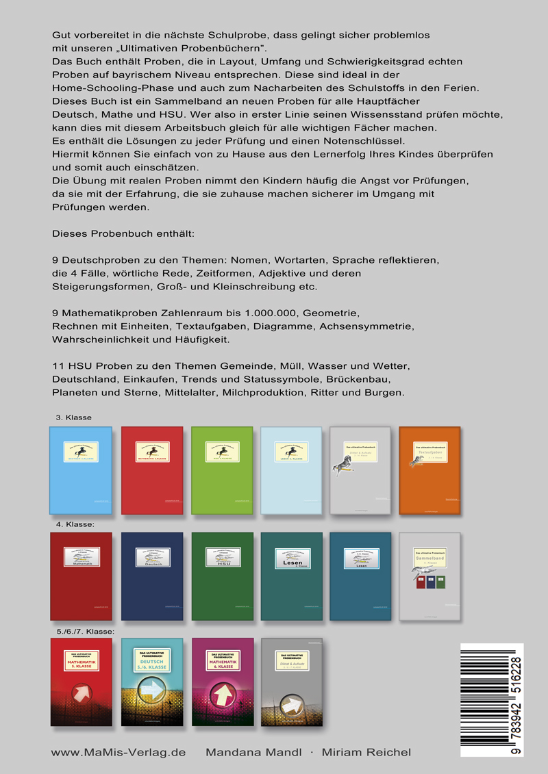 Unsere ultimativen Probenbücher enthalten eine Stoffzusammenfassung, zu jeden Thema drei bis vier Proben, bzw. Tests die inhaltlich und formal den Anforderungen entsprechen und genau das abdecken, was in der Schule gefragt wird, sowie eine Lösung und Notenschlüssel zur Überprüfung der Leistung.