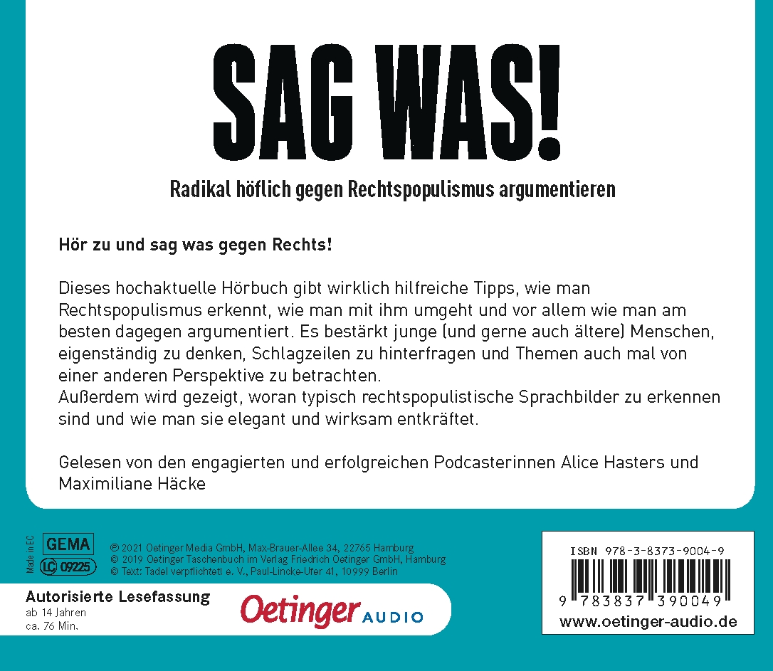 Dieses hochaktuelle Hörbuch gibt wirklich hilfreiche Tipps, wie man Rechtspopulismus erkennt, wie man mit ihm umgeht und vor allem wie man am besten dagegen argumentiert. Es bestärkt junge (und gerne auch ältere) Menschen, eigenständig zu denken, Schlagzeilen zu hinterfragen und angesagte Themen auch mal von einer anderen Perspektive zu betrachten. Vor allem aber wird gezeigt, woran typisch rechtspopulistische Sprachbilder zu erkennen sind und wie man sie elegant und wirksam entkräftet.
