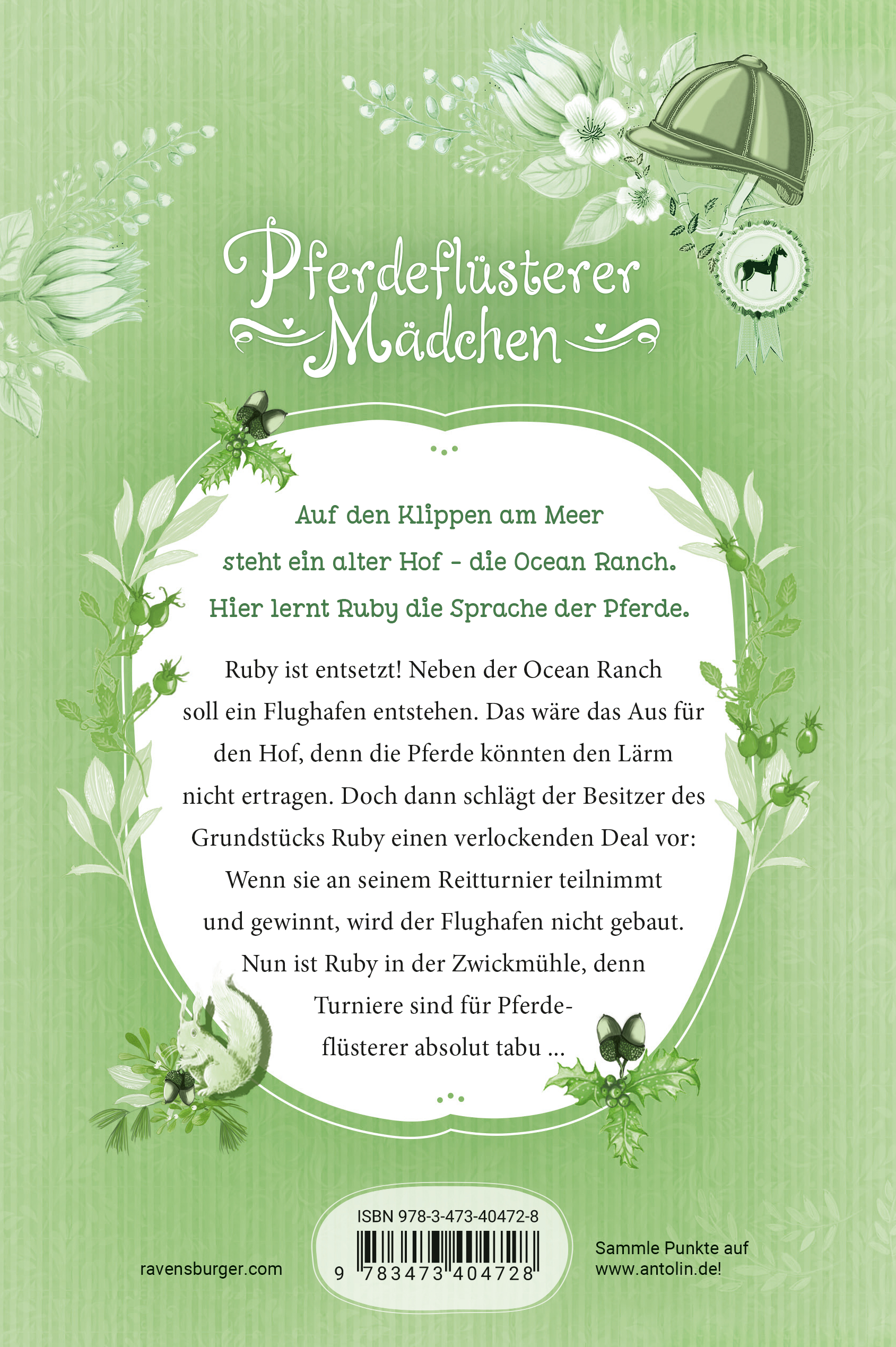 Ruby ist entsetzt: Auf dem Nachbargrundstück der Ocean Ranch soll ein Flughafen entstehen! Das wäre das Aus für den Hof, denn die Pferde könnten den Lärm nicht ertragen. Doch der Besitzer des Grundstücks schlägt Ruby einen fiesen Deal vor: Wenn sie an seinem Reitturnier teilnimmt und gewinnt, wird der Flughafen nicht gebaut. Nun ist Ruby in der Zwickmühle, denn Turniere sind für Pferdeflüsterer streng tabu!