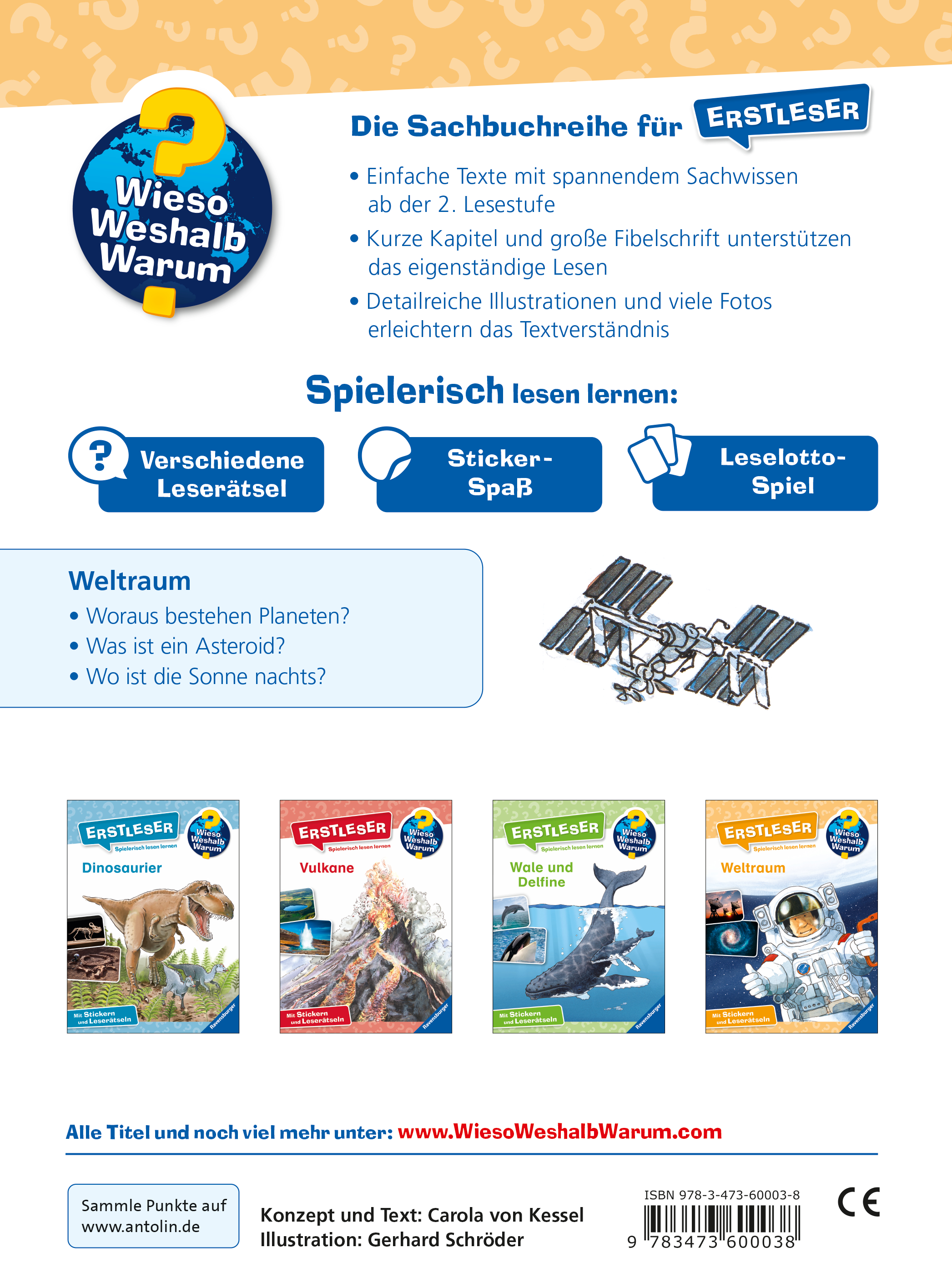 | Schlagworte | 2. Klasse • 3. Klasse • Antolin • Astronaut • Beschäftigung • Buch • Bücher • Erstleser • für Jungen • für Kinder ab 7 Jahre • für Kinder ab {=ATTRVAL(773)} {=ATTRVAL(775)} • für Mädchen • Geschenk • Geschenkidee • ISS • Kinderbuch • Kinderbücher • Leseanfänger • Lesen • Lesen lernen • Mond • Planeten • Rakete • Raumfahrt • Raumschiff • Sachbuch • Sachbücher • Sonnensystem • Sterne • Universum • Weltall • Wieso? Weshalb? Warum? Erstleser • Wissen |