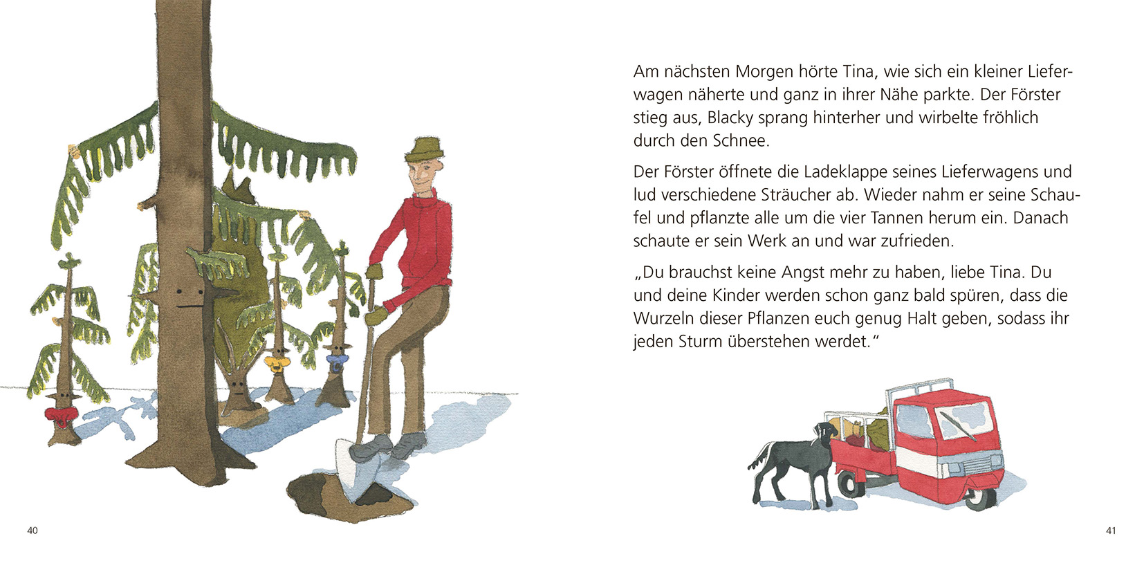 Tina Tannenbaum liebt den Wald, seine tierischen Bewohner und ihren Freund Kasimir, die krumme Tanne. Doch als eines Tages die Waldarbeiter kommen und Mutter und Schwester für ihr neues Leben als Weihnachtsbaum mitnehmen, wirft sie das völlig aus der Bahn. Der nächste heftige Sturm weht die einsame Tina um und kappt dabei ihre Wurzeln. Zwar gräbt der Förster sie wieder ein, aber sie wackelt von nun an - so stark, dass sie sich nicht mehr ausreichend um ihre kleinen Tannenkinder kümmern kann. Doch zum Glück weiß der Förster Rat ...