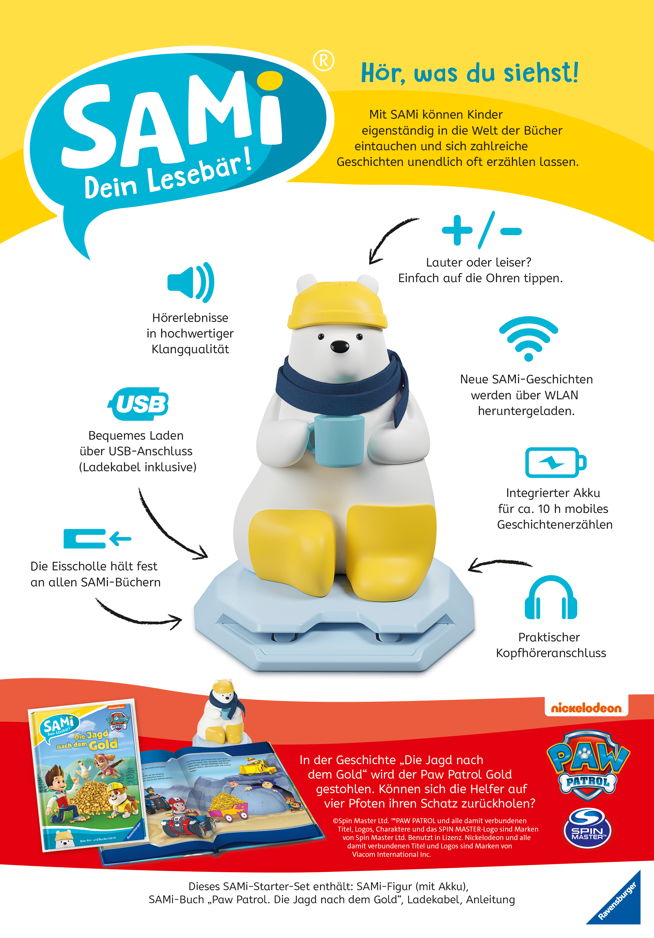 Mit SAMi können Kinder ab 3 Jahre eigenständig in die Welt der Bücher eintauchen und sich zahlreiche Geschichten unendlich oft erzählen lassen.Im Starter-Set enthalten: Ein SAMi Lesebär und ein spannendes Abenteuer mit der Paw Patrol! Ein Dieb geht um in der Abenteuerbucht. Können die Helfer auf vier Pfoten ihn schnappen und das gestohlene Gold zurückbringen?