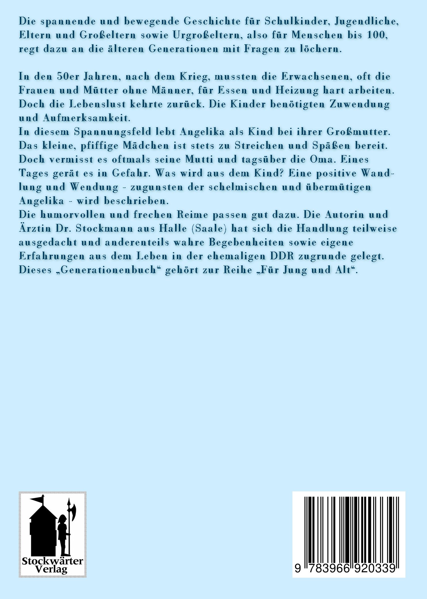 Die humorvollen und frechen Reime passen gut dazu. Die Autorin und Ärztin Dr. Stockmann aus Halle (Saale) hat sich die Handlung teilweise ausgedacht und anderenteils wahre Begebenheiten sowie eigene Erfahrungen aus dem Leben in der ehemaligen DDR zugrunde gelegt. Dieses "Generationenbuch" gehört zur Reihe "Für Jung und Alt".