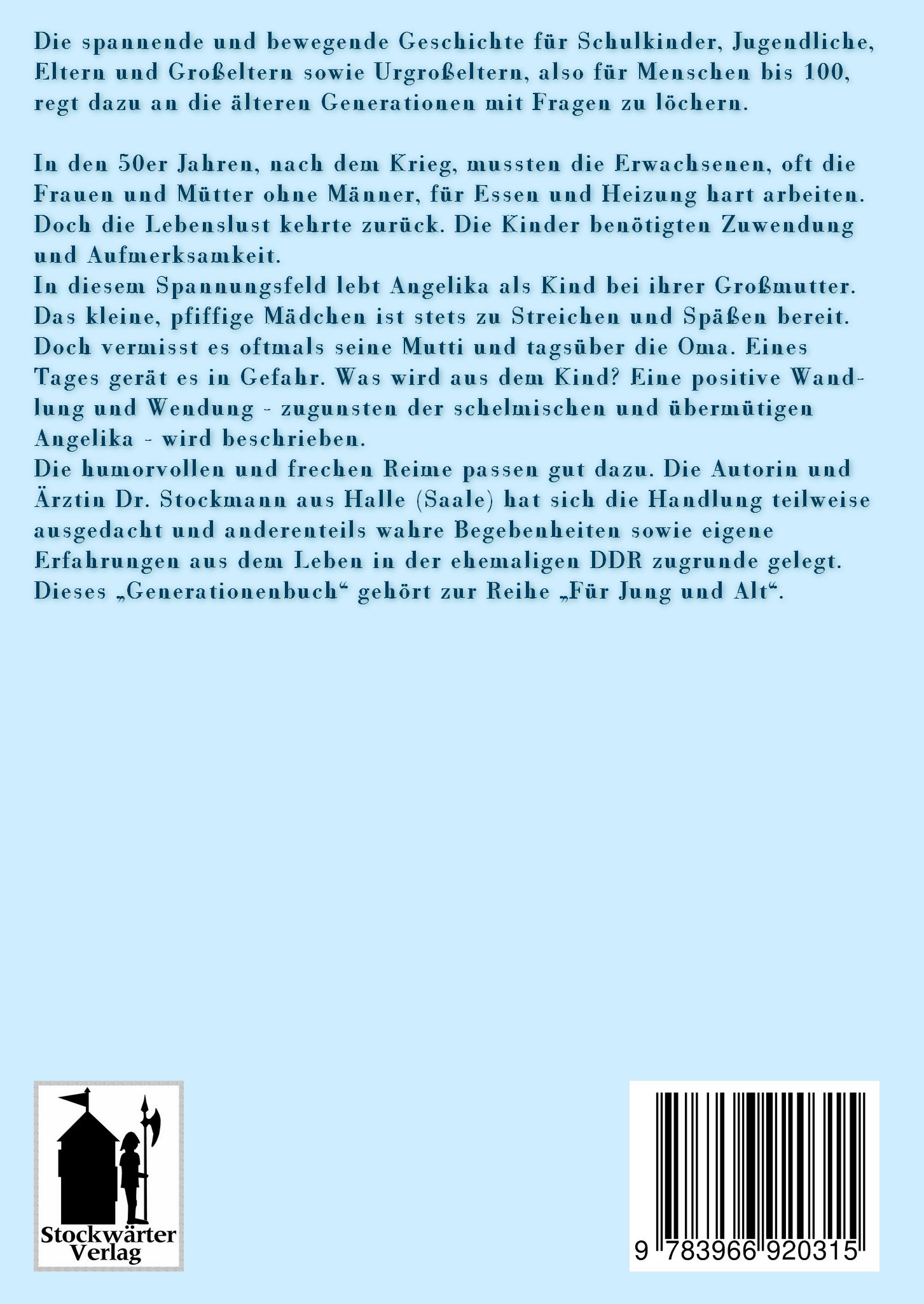 Die humorvollen und frechen Reime passen gut dazu. Die Autorin und Ärztin Dr. Stockmann aus Halle (Saale) hat sich die Handlung teilweise ausgedacht und anderenteils wahre Begebenheiten sowie eigene Erfahrungen aus dem Leben in der ehemaligen DDR zugrunde gelegt. Dieses "Generationenbuch" gehört zur Reihe "Für Jung und Alt".