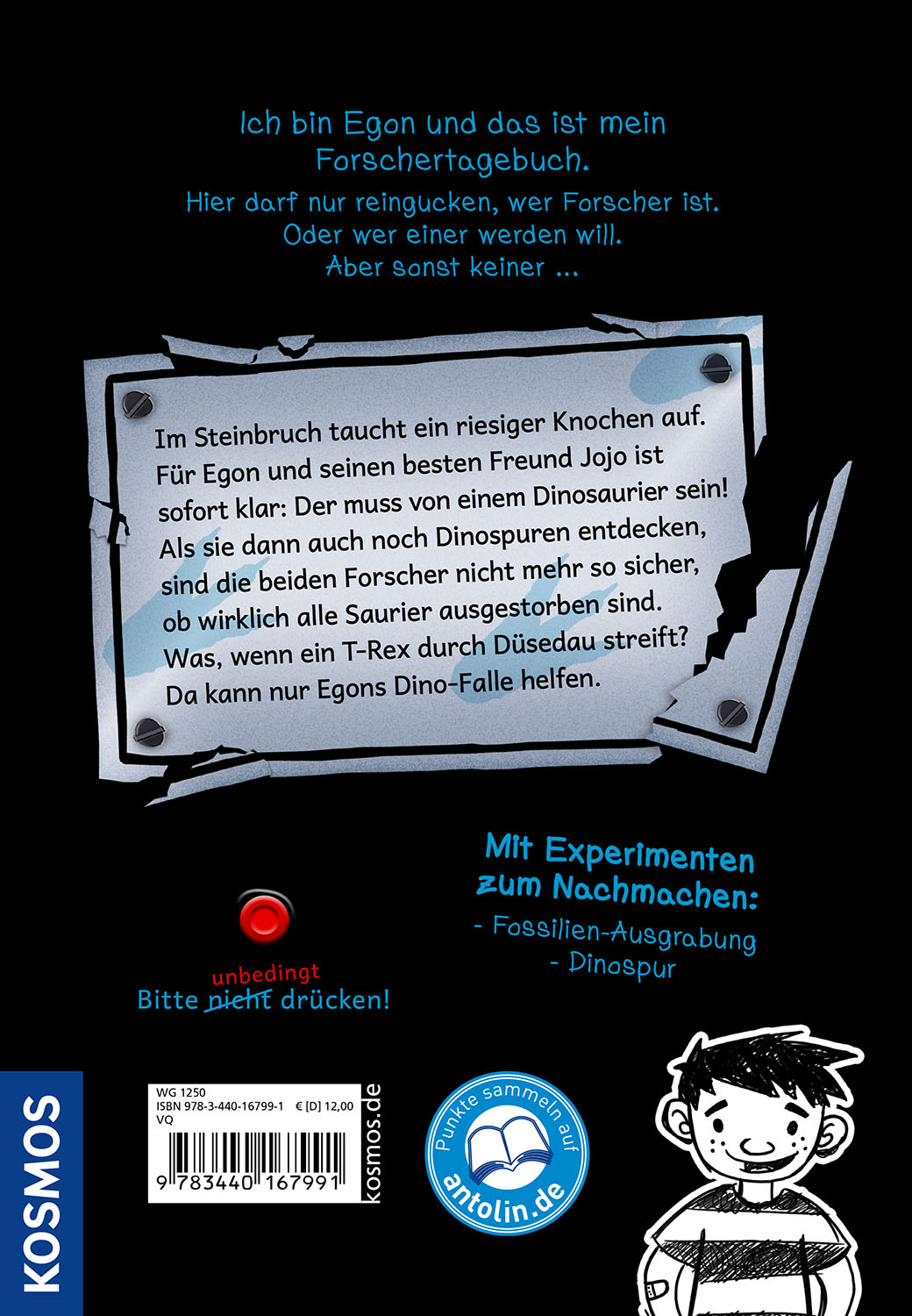 Ich bin Egon und das ist mein Forscher-Tagebuch. Hier darf nur reingucken, wer Forscher ist. Oder wer einer werden will. Aber sonst keiner ...Diesmal tauchen seltsame Tierspuren im Wald auf. Und Blöd-Ben will einen echten Saurier gesehen haben. Ob das stimmen kann? Egon und Jojo bauen jedenfalls eine Dino-Falle und stolpern wieder von einer Katastrophe in die nächste. Lustiges Chaos garantiert! Für alle, die selbst gerne forschen möchten, gibt es im Buch spannende Dino-Experimente zum Nachmachen.