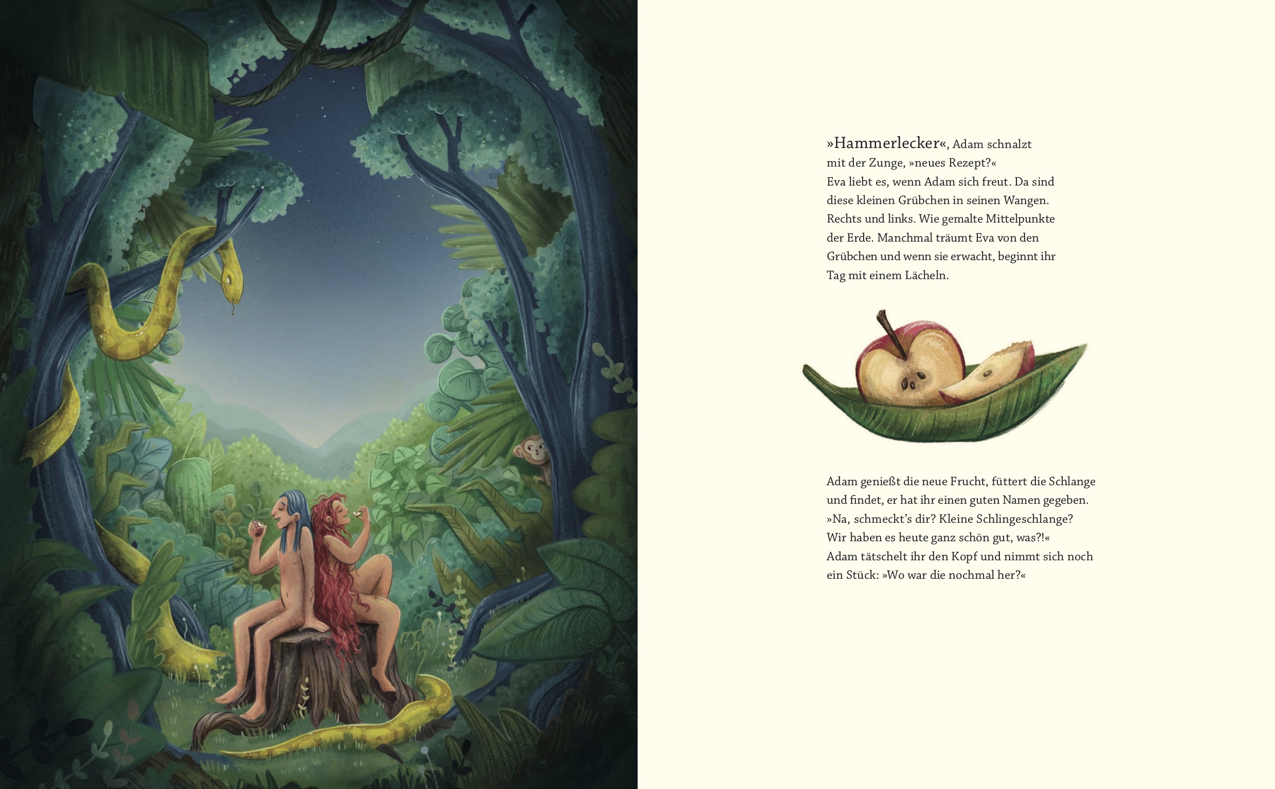 Adam langweilt sich: Zwar lebt er in einem prächtigen Garten, in dem er allen Tieren und Pflanzen einen Namen gegeben hat, doch so als einziger Mensch fühlt er sich allein. Eines Tages taucht Eva auf. Solch eine Gestalt hat Adam noch nie gesehen, so stark und rund und klug! Gemeinsam erfinden sie Yoga und Mangosalat und erleben ein ganz besonderes