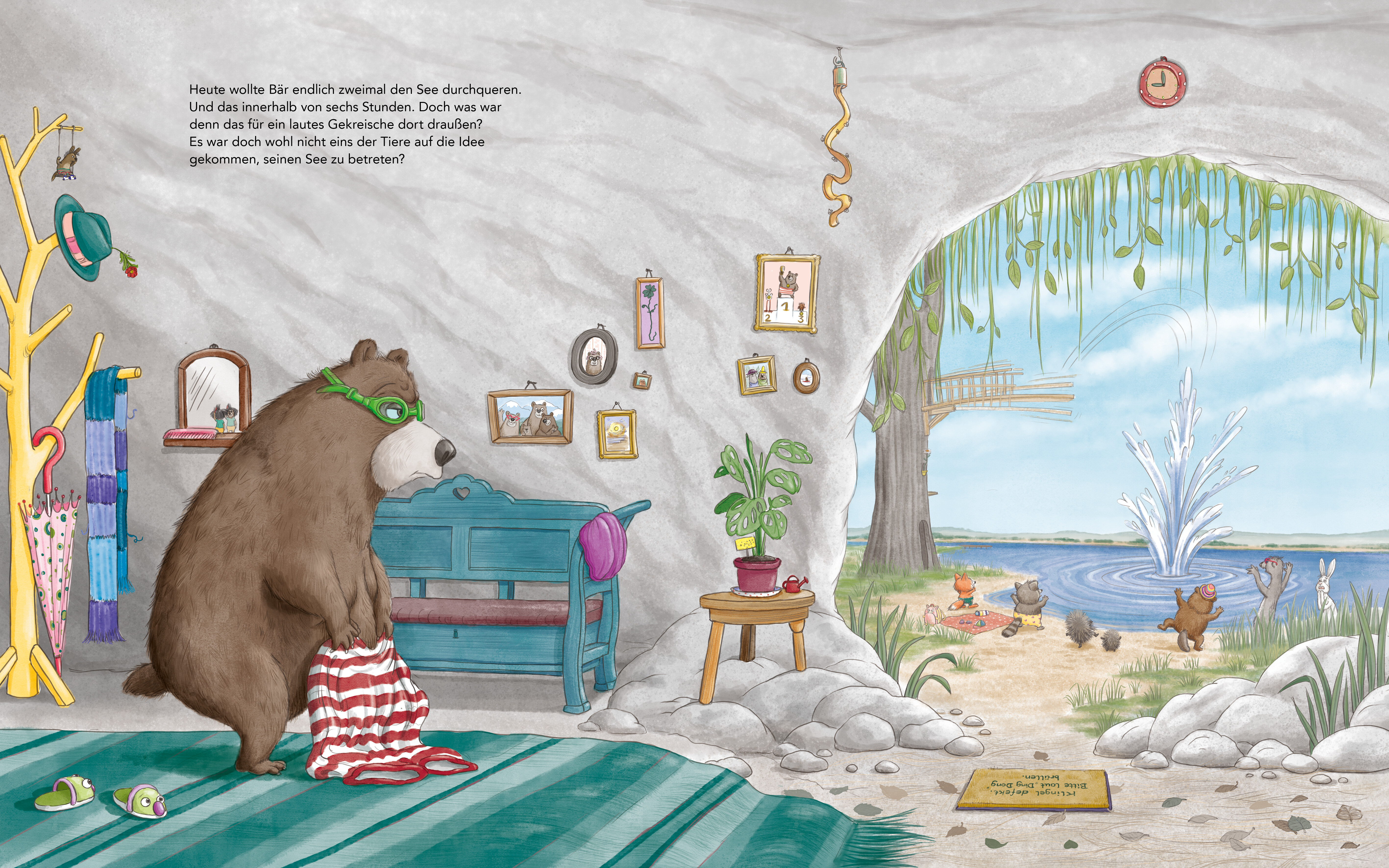 Es ist ein herrlicher Sommertag am See und Schwein ist bereit: Es hat seinen Schwimmreif, seine Schwimmflügel und jede Menge gute Laune. Als es auf den See zustapft, schauen sich die anderen Tiere besorgt an. Weiß Schwein denn nicht, dass Bär jeden Tag für die Schwimmmeisterschaft trainiert und richtig böse werden kann, wenn man in seinem See planscht?