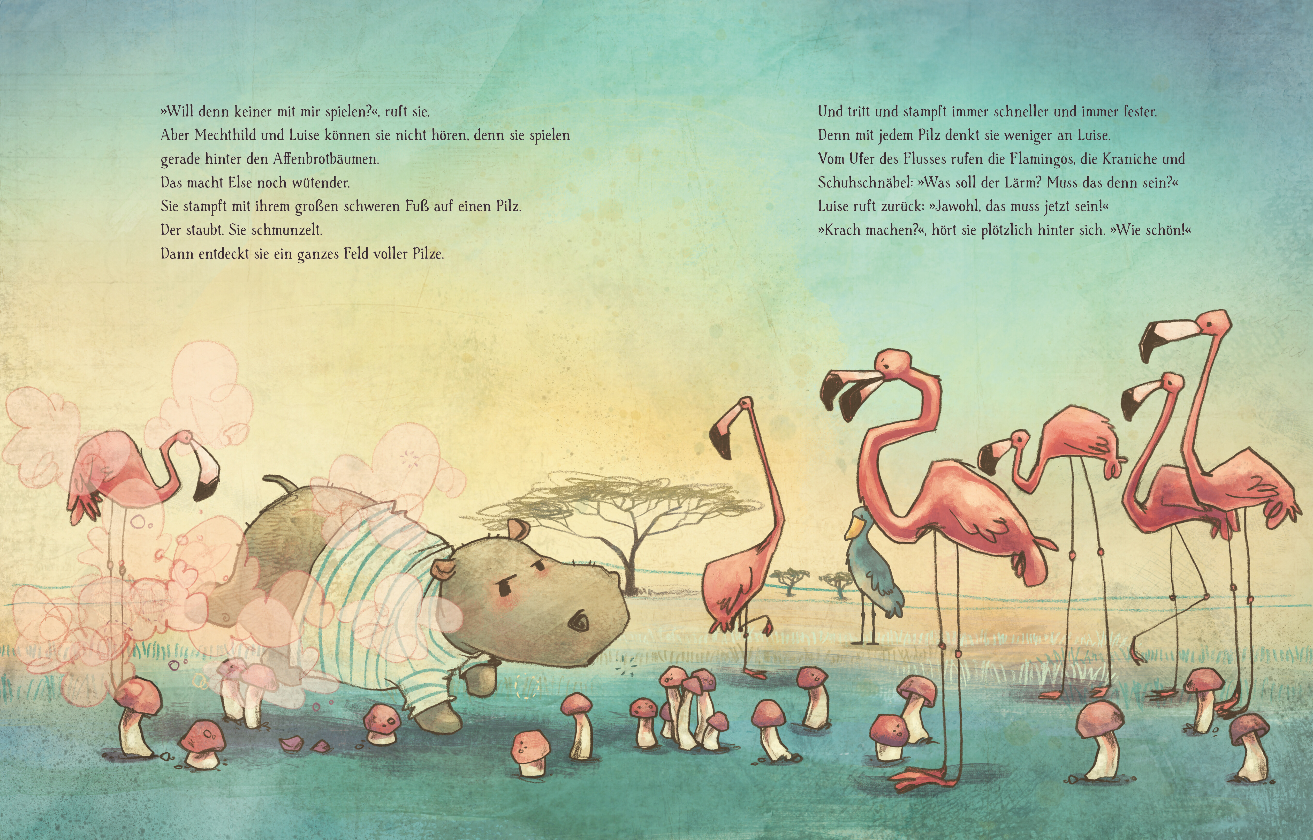 Else und Luise sind Flusspferde - und allerbeste Schwestern. Doch als eines Tages das Nashorn Mechthild auftaucht, freundet sich Luise mit ihr an. Immer öfter spielt Luise jetzt mit Mechtild und hat keine Zeit mehr für ihre kleine Schwester. Mag Luise Else jetzt nicht mehr? Else ist erst enttäuscht, dann traurig und dann wütend! Als sie wutschnaubend durch die Gegend stapft, tauchen Luise und Mechthild auf und trampeln begeistert mit. Vielleicht mag Luise Else ja doch noch? Und vielleicht ist auch Mechthild ganz nett?
