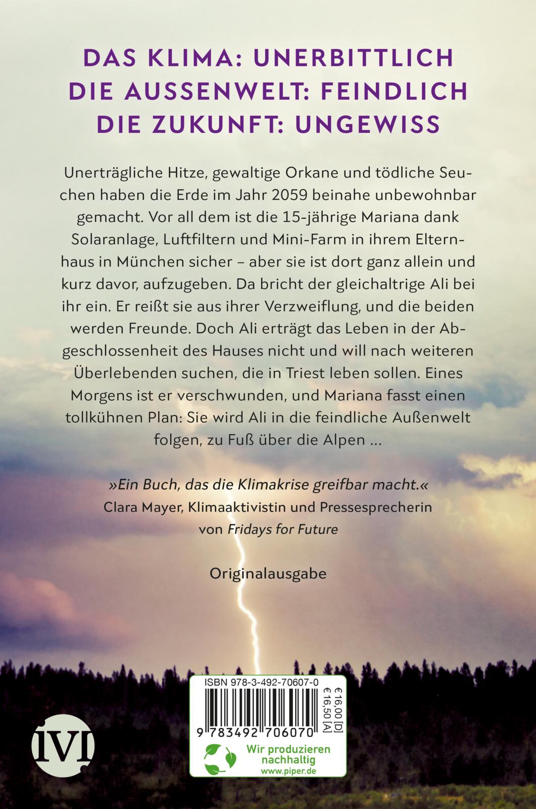 Unerträgliche Hitze, gewaltige Orkane und tödliche Seuchen haben die Erde im Jahr 2059 beinahe unbewohnbar gemacht. Vor all dem ist die 15-jährige Mariana im Haus ihrer Eltern in München sicher - doch sie ist ganz allein und kurz davor aufzugeben. Das ändert sich, als der gleichaltrige Ali bei ihr einbricht. Er reißt sie aus ihrer Verzweiflung und die beiden werden Freunde. Ali will jedoch nicht bleiben. Er erträgt die abgeschlossene Welt im Haus nicht und will weitere Überlebende suchen. Eines Morgens ist er verschwunden, und Mariana fasst einen tollkühnen Plan: Sie wird Ali in die feindliche Außenwelt folgen, zu Fuß über die Alpen ...