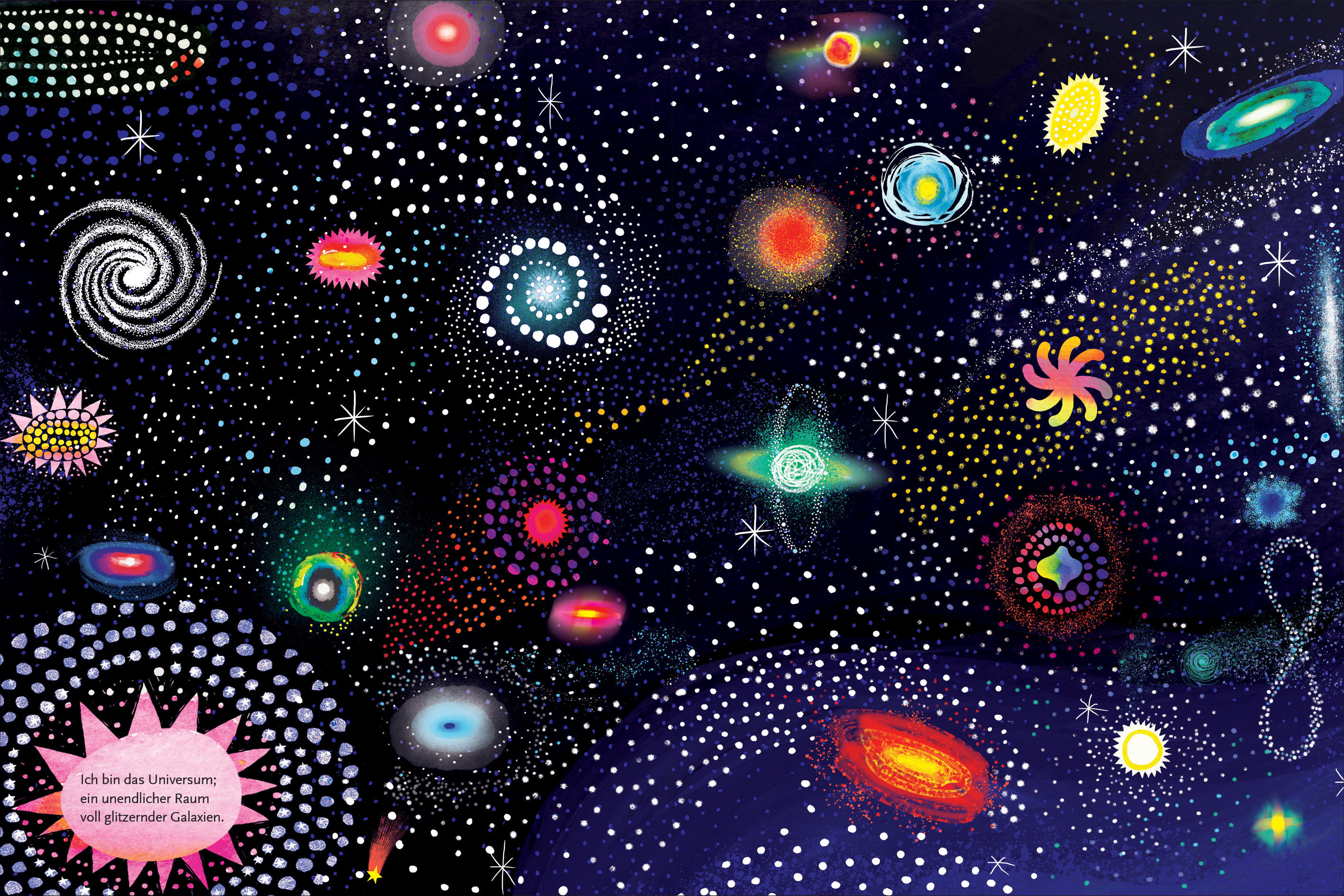 Komm mit auf eine atemberaubende Reise durch glitzernde Galaxien und glühendes Sternenlicht. Bis hin zu einem Planeten voll von Leben und einem Kind, das aus dem Fenster zu den Sternen blickt. Es ist eine Reise in die Unendlichkeit des Universums, zu den Planeten unseres Sonnensystems, mitten hinein in die galaktische Spirale der Milchstraße und zurück in eine bunte Welt mit tiefblauen Ozeanen und den geschäftigen Straßen einer Stadt, in deren Bauch ganz unterschiedliche Menschen in Familien zusammenleben.»Das Universum und ich« ist ein buntes Kaleidoskop, das schon den Kleinsten zeigt, wie alles miteinander zusammenhängt. Und welcher Platz in diesem unendlichen Ganzen uns gebührt. Eine majestätische Welt funkelnder Wunder, die es zu schützen gilt.
