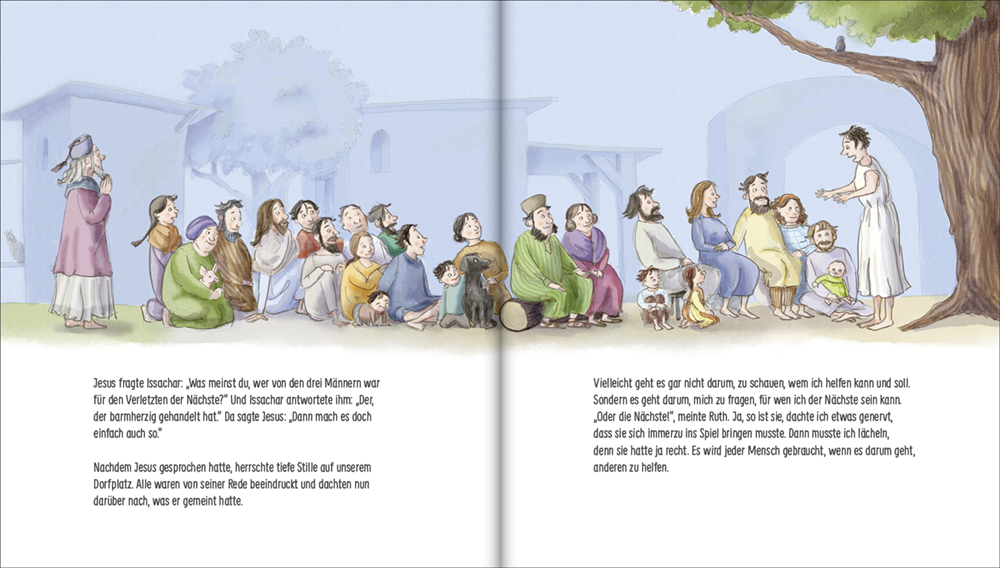 Ruben wohnt mit seiner Familie in Jericho. Seine Eltern verkaufen dort in ihrem kleinen Laden Brot und Kuchen. In letzter Zeit kommt immer wieder Jesus aus Nazareth in ihrem Dorf vorbei. Mit ihm sind einige Männer und Frauen unterwegs, die ihn schon lange auf seinen Wanderungen begleiten. Jedes Mal, wenn jemand ruft: »Jesus kommt!«, laufen Ruben und seine Zwillingsschwester Ruth mit vielen anderen Leuten auf den Marktplatz, denn alle sind gespannt, was Jesus dieses Mal zu berichten hat. Und die Geschichte, die Jesus erzählt, handelt diesmal vom barmherzigen Samariter ...
