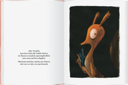 Das Eichhörnchen kennt sich aus mit Bäumen. Vor allen Dingen mit SEINEM Baum. Der hat leckere Zapfen. Ab und zu darf man ein paar davon nehmen. Aber Vorsicht! Nur so viele, wie man braucht. Denn: "So ein Baum ist superempfindlich. Man muss gut auf ihn aufpassen." Na ja, und dann hat der Baum ja auch noch Nadeln. Die schmecken zart und ein bisschen süß. Und Zweige, die braucht man für ein Feuerchen ...