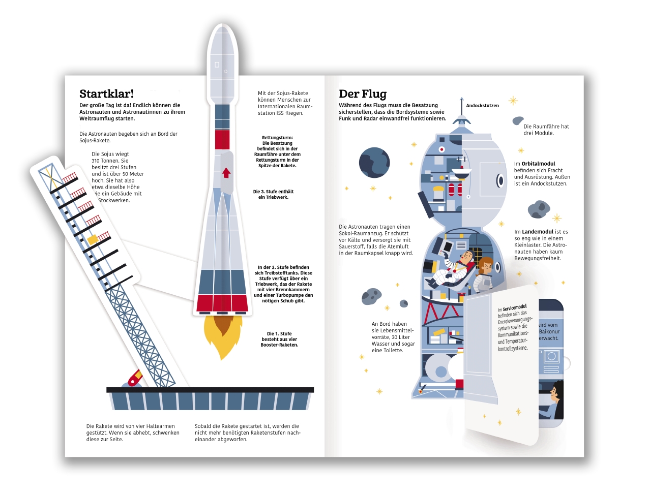 In diesem Sach- und Spielbuch mit 20 Klappen und Spielelementen begleitet der Leser drei Astronauten auf ihre Reise ins All. Man erfährt, wie Astronauten trainiert werden, wie eine Rakete funktioniert und kann sich die Internationale Raumstation ISS von innen ansehen. Ein spannender Ausflug für kleine Weltraumforscher!