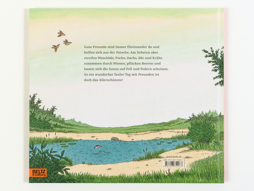 Waschbär will Apfelkuchen backen. Doch weil er keine Eier hat, macht er sich auf den Weg zu Fuchs, der eine Leiter braucht. Sie spazieren zu Dachs. Der hat alles. Aber auch der benötigt Hilfe - von Bär. So ziehen sie zu viert (mit Krähe) weiter durch Wiesen, naschen Brombeeren und finden Bär mit der Angel am Bach. Poetisch, mit leichtem Federstrich erzählt Philip Waechter von fünf Freunden, die füreinander da sind, sich die Sonne auf den Pelz scheinen lassen und einen großartigen Tag miteinander verbringen.