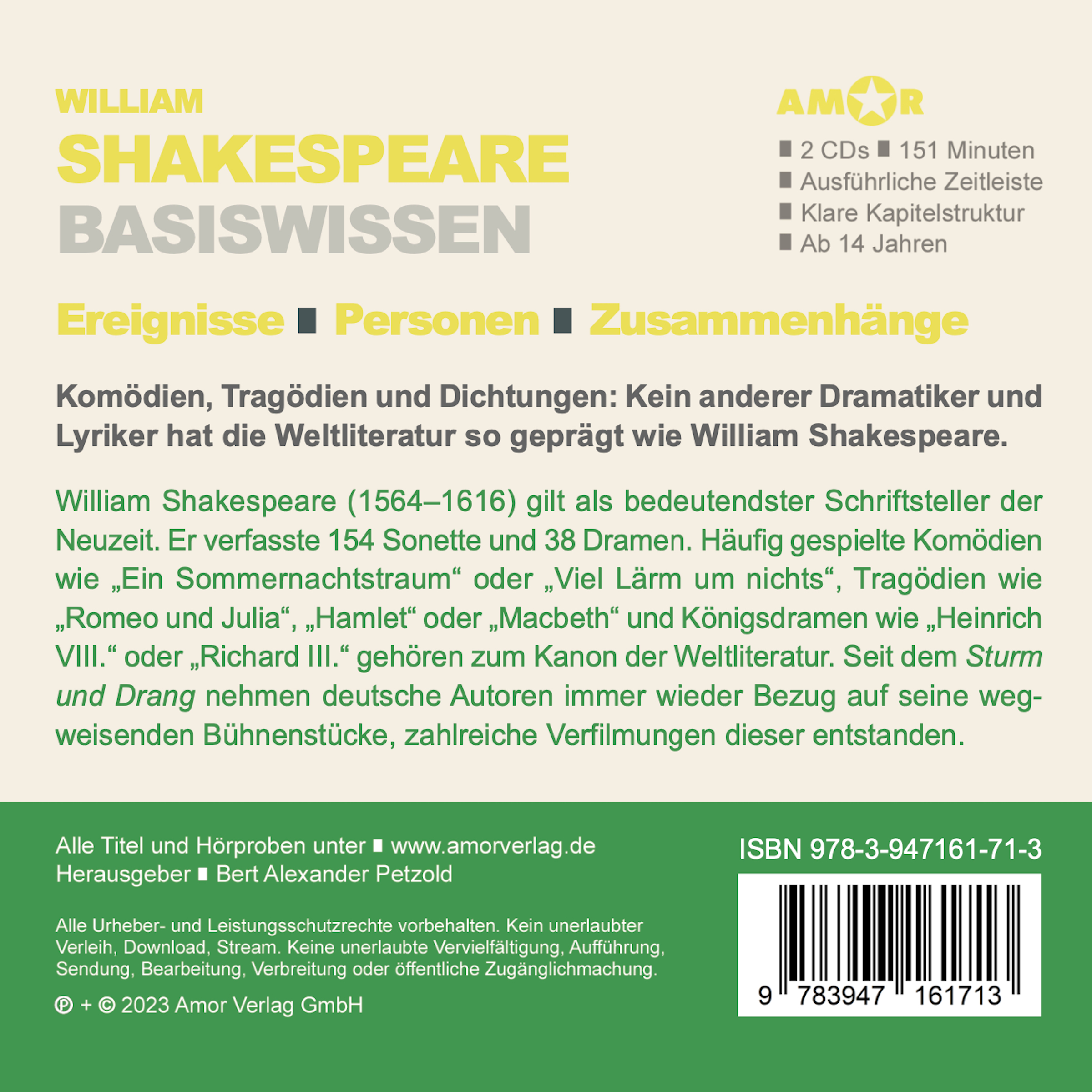 | Schlagworte | Abiturwissen • Allgemeinwissen • Amor Verlag • Basiswissen • Bert A. Petzold • Bildung • Biografie • Die Bürgschaft • Friedrich Schiller • Globe Theatre • Grundkenntnisse • Hamlet • Hörbuch • Klassiker • Kompaktwissen • Lesung • London • René Wagner • Romeo und Julia • Schüler • Shakespeare |