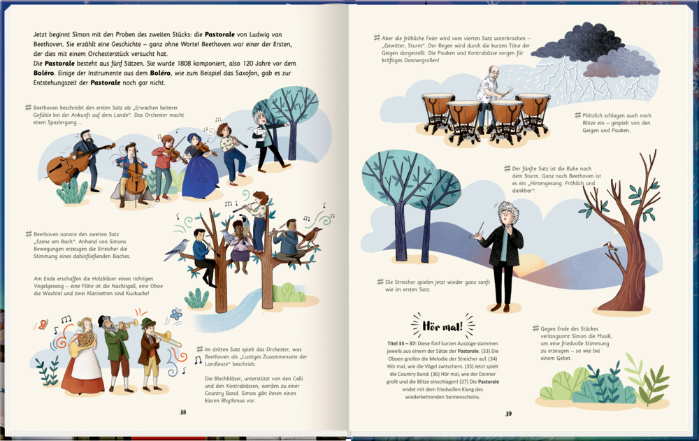 Musik schafft es, Menschen auf der ganzen Welt miteinander zu verbinden. Das große Orchesterbuch lädt uns ein, diesen Zauber mitzuerleben. Sir Simon Rattle erzählt, welche Instrumente zu einem Symphonieorchester gehören. Dabei nimmt er uns mit auf eine Reise in die Welt der Musik, vom Vorspiel bis zum großen Konzertabend. Wir erfahren alles Wichtige über die Instrumente: ob Holz- oder Blechbläser, ob hohes oder tiefes Streichinstrument.