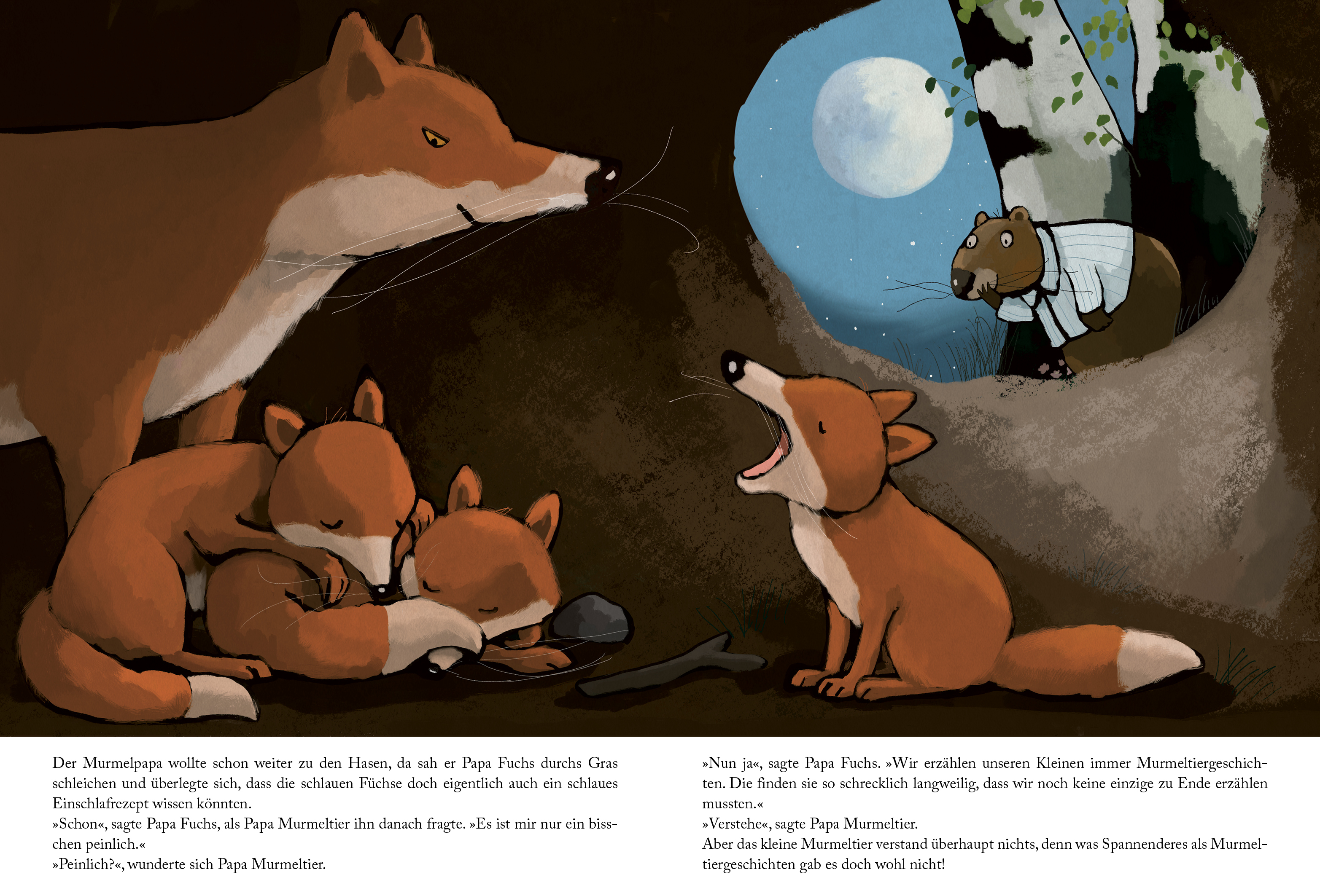 Was tun, wenn die Murmelkinder einfach nicht schlafen wollen? Der gesamte Wald gibt Papa Murmeltier Tipps, doch keiner will so recht zum kleinen Murmel passen. Bis die beiden schließlich ihre ganz eigene Lösung finden.