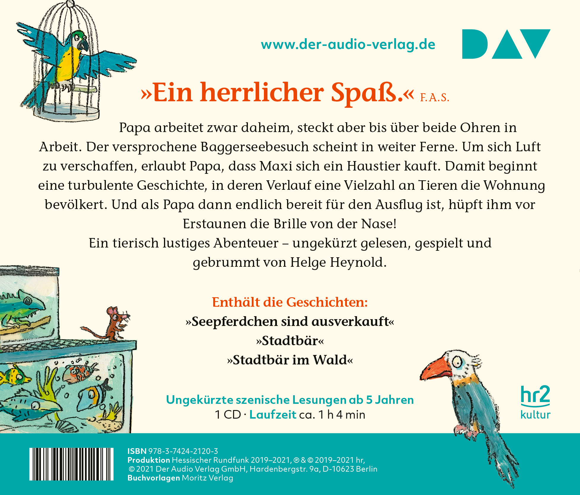 Maxis Papa arbeitet zwar daheim, steckt aber bis über beide Ohren in Arbeit. Der versprochene Baggerseebesuch scheint in weiter Ferne! Um sich Luft zu verschaffen, erlaubt Papa Maxi, sich ein Haustier zu kaufen. Damit beginnt eine turbulente Geschichte, in deren Verlauf eine Vielzahl an Tieren die Wohnung bevölkert. Als Papa endlich bereit für den Ausflug ist, hüpft ihm vor Erstaunen die Brille von der Nase! Das Hörbuch enthält die Geschichten: - Seepferdchen sind ausverkauft - Stadtbär - Stadtbär im Waldszenische Lesung mit Musik mit Helge Heynold1 CD | ca. 1 h 4 min