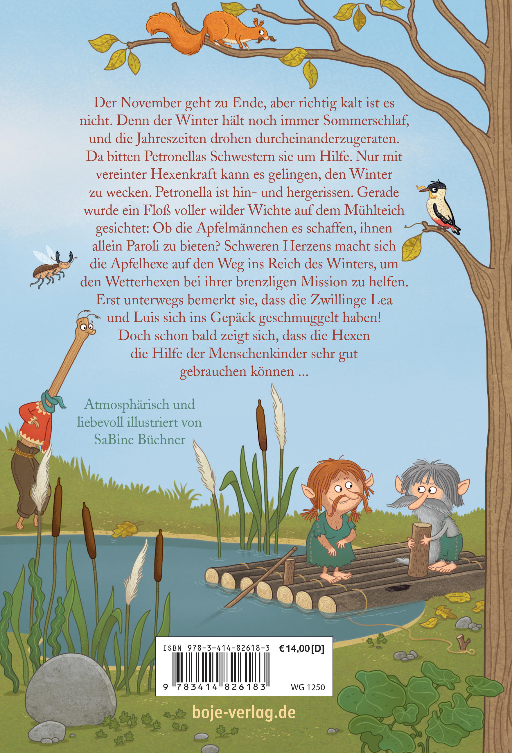 Der November geht zu Ende, doch richtig kalt ist es nicht, denn der Winter hält noch Sommerschlaf. Da bitten Petronellas Schwestern, die Wetterhexen, sie um Hilfe. Nur gemeinsam kann es gelingen, den Winter zu wecken. Alles andere als begeistert macht sich die Hexe auf die Reise. Auf dem Mühlteich wurde ein Floß voller Grimmbärte gesichtet - ob die Apfelmännchen es schaffen, ihnen Paroli zu bieten? Unterwegs dann die Überraschung: Lea und Luis haben sich ins Reisegepäck geschmuggelt! Was zuerst ein Ärgernis ist, erweist sich bald als Segen ...