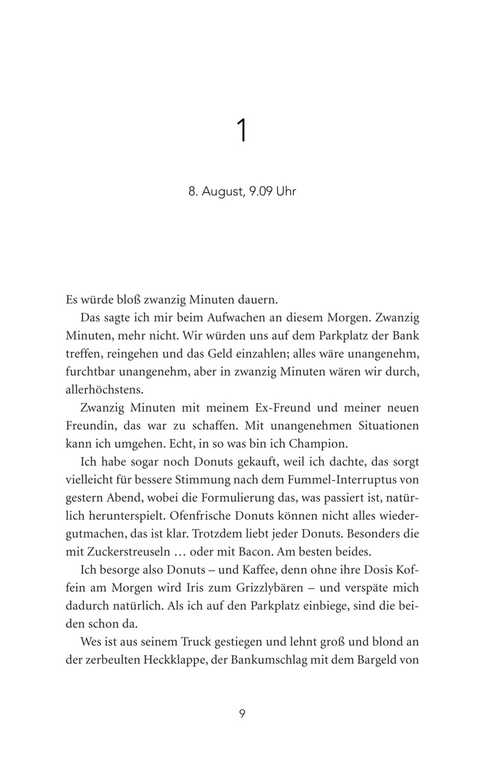 Meine Hände schwitzen. Ich kralle die Finger zusammen – Gott, wie lang geht das jetzt? Zwei Minuten? Fünf? Die Zeit verhält sich seltsam, wenn du auf dem Boden liegst und ein Typ mit einer Knarre vor deinem Gesicht herumfuchtelt.