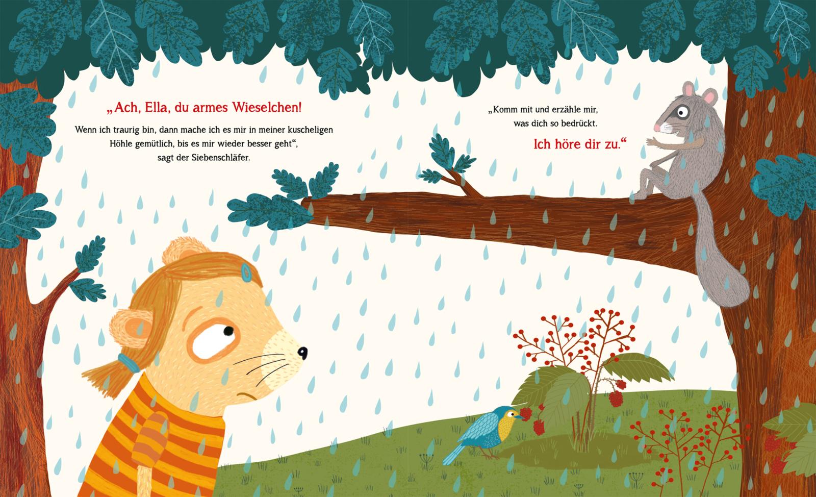 Zum Glück leben im Wald ganz viele andere Tiere, die Ellas Not erkennen und ihr Trost spenden möchten. Und dabei hat jedes Tierchen eine ganz eigene Strategie: kuscheln, zuhören, Grimassen schneiden, wild hüpfen. Was hilft wohl am besten gegen Ellas Traurigkeit?