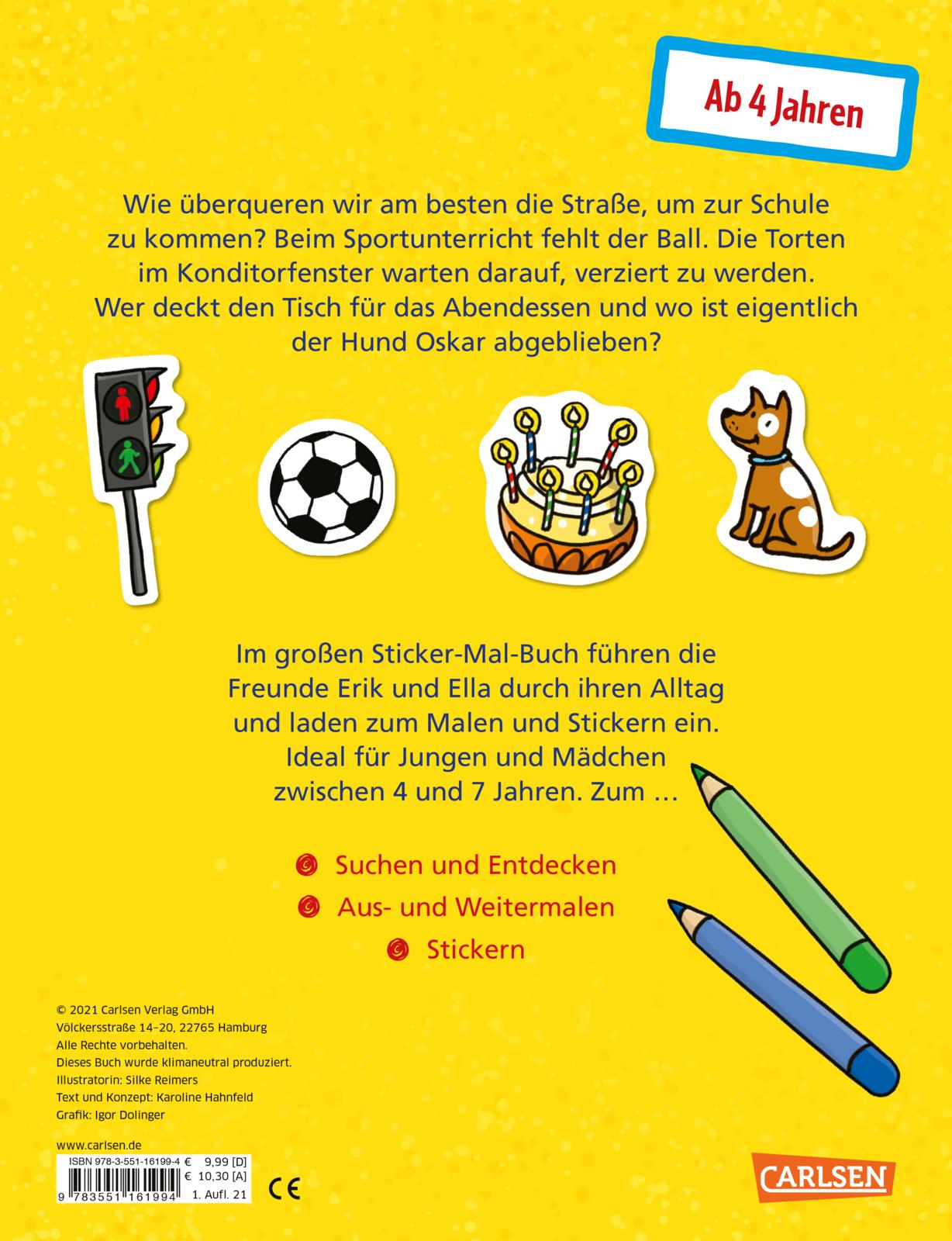 Im großen Sticker-Mal-Buch führen die Freunde Erik und Ella durch ihren Alltag und laden zum Malen und Stickern ein. Hier gibt es jede Menge zu