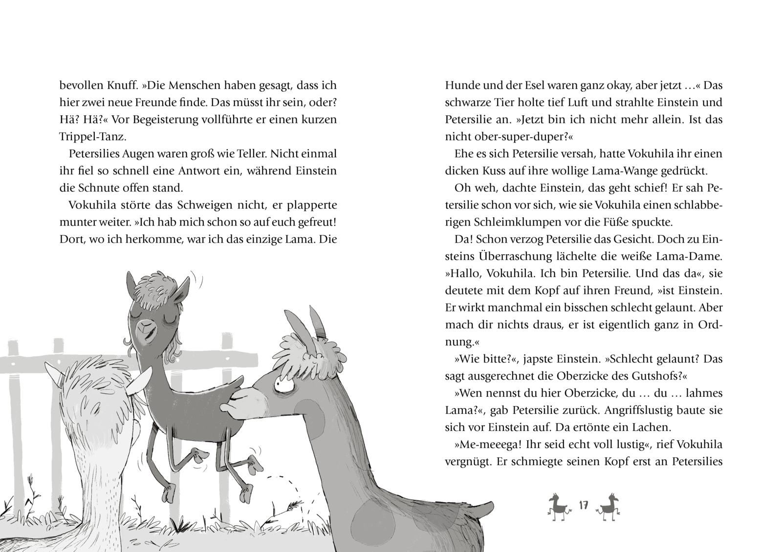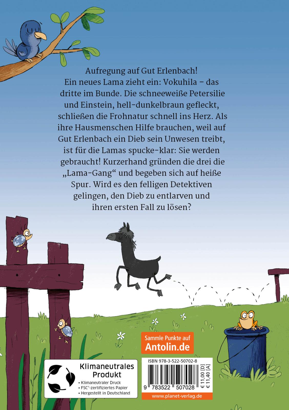 Aufregung auf Gut Erlenbach! Ein neues Lama zieht auf dem Bauernhof ein: Vokuhila - das dritte im Bunde. Die schneeweiße Petersilie und Einstein, hell-dunkelbraun gefleckt, schließen die Frohnatur schnell ins Herz. Als ihre Hausmenschen Hilfe brauchen, weil auf Gut Erlenbach ein Dieb sein Unwesen treibt, ist für die Lamas spucke-klar: Sie werden gebraucht! Kurzerhand gründen die drei Tiere die „Lama-Gang“ und begeben sich auf eine heiße Spur. Wird es den felligen Detektiven gelingen, den Dieb zu entlarven und ihren ersten Fall zu lösen?