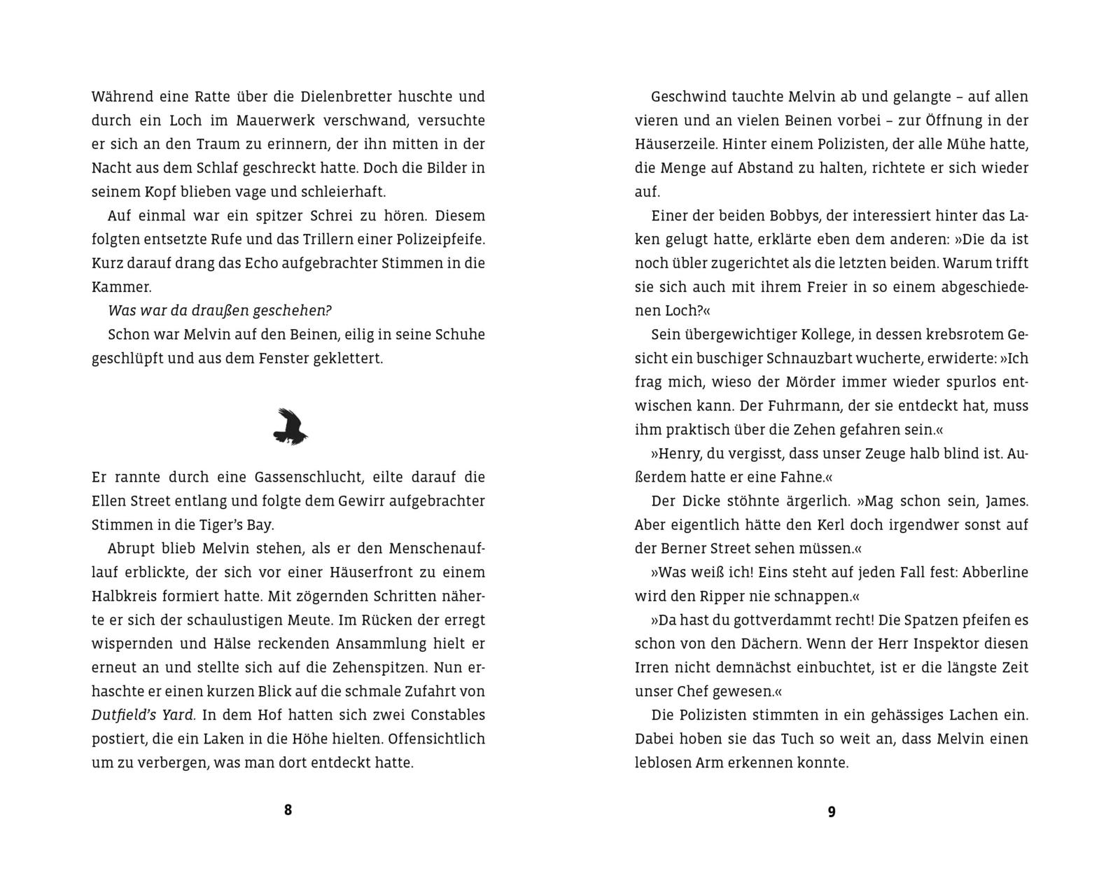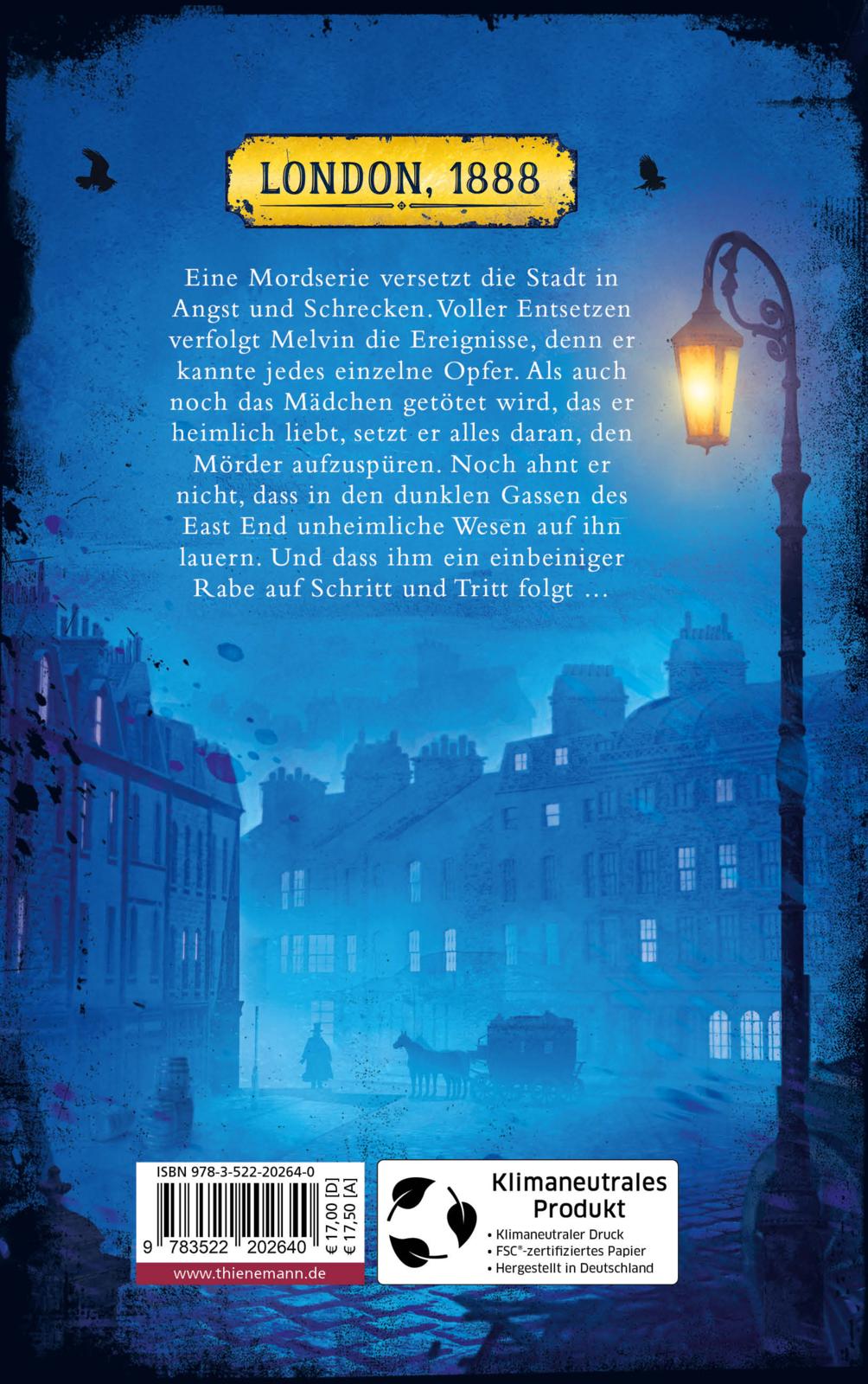 Eine Mordserie versetzt die Stadt in Angst und Schrecken. Voller Entsetzen verfolgt Melvin die Ereignisse, denn er kannte jedes einzelne Opfer. Als auch noch das Mädchen getötet wird, das er heimlich liebt, setzt er alles daran, den Mörder aufzuspüren. Noch ahnt er nicht, dass in den dunklen Gassen des East End unheimliche Wesen auf ihn lauern. Und dass ihm ein einbeiniger Rabe auf Schritt und Tritt folgt …