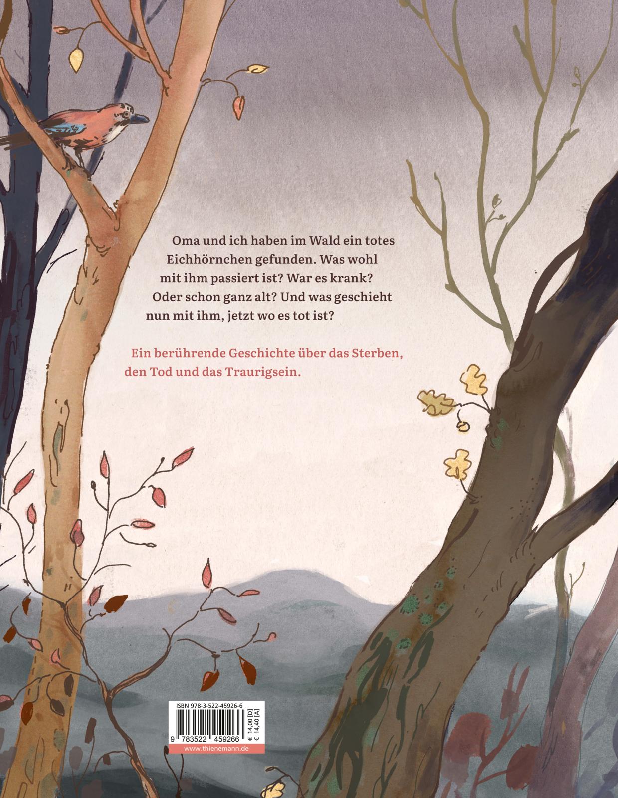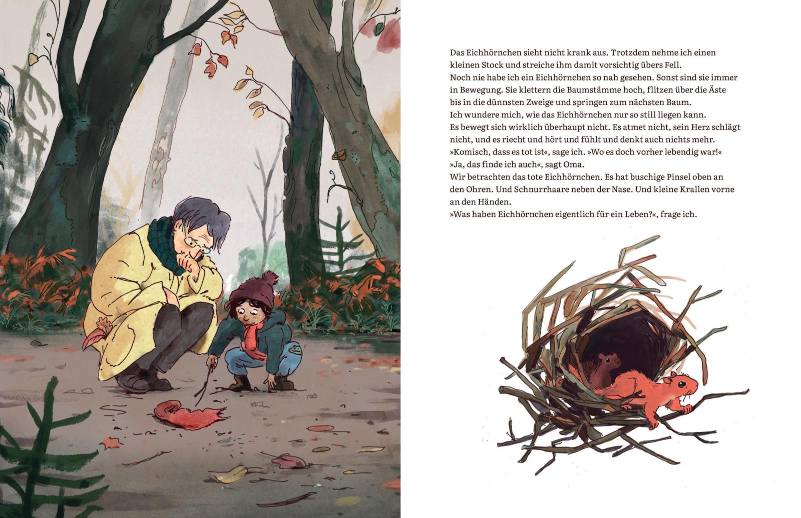 Ein Kind und seine Oma finden beim Spaziergang durch den Wald ein totes Eichhörnchen. Was wohl mit ihm passiert ist? Ob es krank war? Oder schon ganz alt? Und was passiert nun mit dem Eichhörchnchen, jetzt, wo es tot ist?