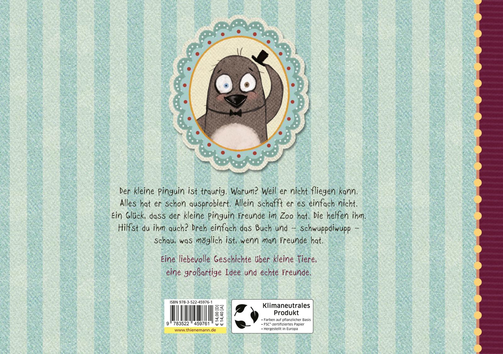 Der kleine Pinguin ist traurig. Warum? Weil er nicht fliegen kann. Alles hat er schon ausprobiert. Allein schafft er es einfach nicht. Ein Glück, dass der kleine Pinguin Freunde im Zoo hat. Die helfen ihm. Hilfst du ihm auch? Dreh einfach das Buch und - schwuppdiwupp - schau, was möglich ist, wenn man Freunde hat. Eine liebevolle Geschichte über kleine Tiere, eine großartige Idee und echte Freunde.
