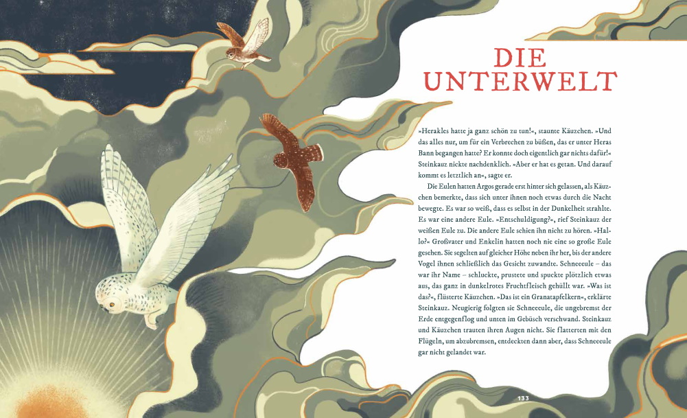 Der Ansatz der Wissenschaftlerin und Mythen-Expertin Marchella Ward ist dabei originell und frisch zugleich: Wir begleiten eine kleine Eule mit ihrem Großvater zu den berühmtesten mythischen Stätten und lauschen der weisen alten Eule, wie sie der jungen Eule die Sagen und Geschichten erläutert. Ein Stammbaum zeigt auf anschauliche Weise die Familienzusammenhänge der Helden und Götter und eine Karte vom alten Griechenland erleichtert die Verortung der antiken Schauplätze. Die Illustrationen von Sander Berg machen diese zeitlosen Klassiker zu einem Leseerlebnis, das man nicht so schnell vergisst.