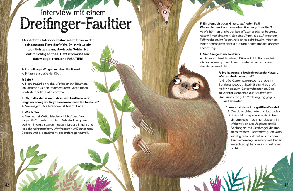 Hier hat jedes Tier seine ganz eigene Geschichte zu erzählen und tut das in seiner ganz unverwechselbaren Art. Mundgerechte Texte im Frage-und-Antwortformat, gepaart mit humorvollen Illustrationen sind genau richtig für junge Leserinnen und Leser und alle angehenden Tierfreunde, die neugierig auf das Leben wilder Tiere sind. Das lustige Sachbuch enthält Interviews mit einem Tiger, Wolf, Honigdachs, Riesengürteltier, Löwen, Jaguar, Ameisenbär, Schneeleoparden, Eisbären und Dreizehenfaultier. Außerdem erfahren wir, was wir selbst für bedrohte Arten und ihre Lebensräume tun können.