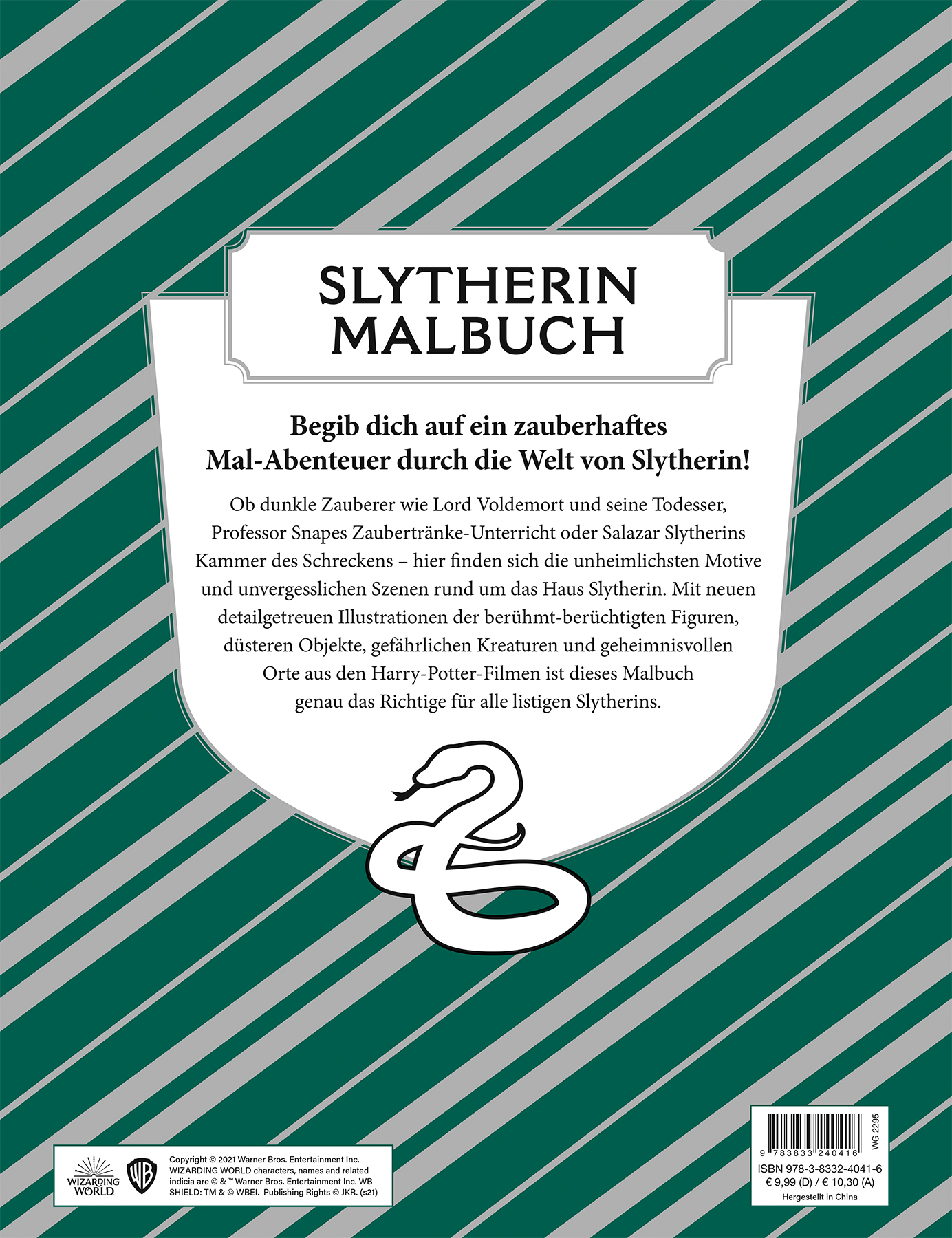 SLYTHERIN MALBUCHBegib dich auf ein zauberhaftes Mal-Abenteuer durch die Welt von Slytherin!Ob dunkle Zauberer wie Lord Voldemort und seine Todesser, Professor Snapes Zaubertränke-Unterricht oder Salazar Slytherins Kammer des Schreckens - hier finden sich die unheimlichsten Motive und unvergesslichen Szenen rund um das Haus Slytherin. Mit neuen detailgetreuen Illustrationen der berühmt-berüchtigten Figuren, düsteren Objekte, gefährlichen Kreaturen und geheimnisvollen Orten aus den Harry-Potter