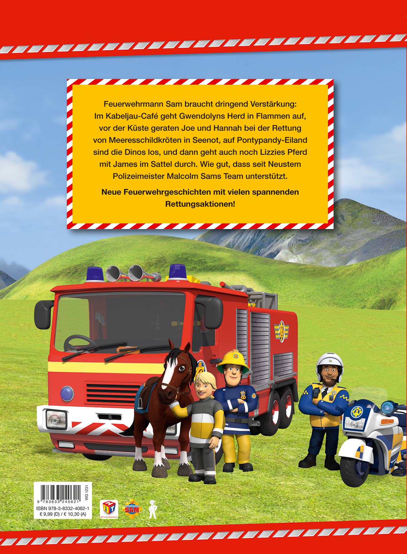 Feuerwehrmann Sam bracht dringend Verstärkung: Im Kabeljau-Café geht Gwendolyns Herd in Flammen auf, vor der Küste geraten Joe und Hannah bei der Rettung von Meeresschildkröten in Seenot, auf Pontypandy-Eiland sind die Dinos los, und dann geht auch noch Lizzies Pferd mit James im Sattel durch. Wie gut, dass seit Neuestem Polizeimeister Malcolm Sams Team unterstützt. Neue Feuerwehrgeschichten mit vielen spannenden Rettungsaktionen!