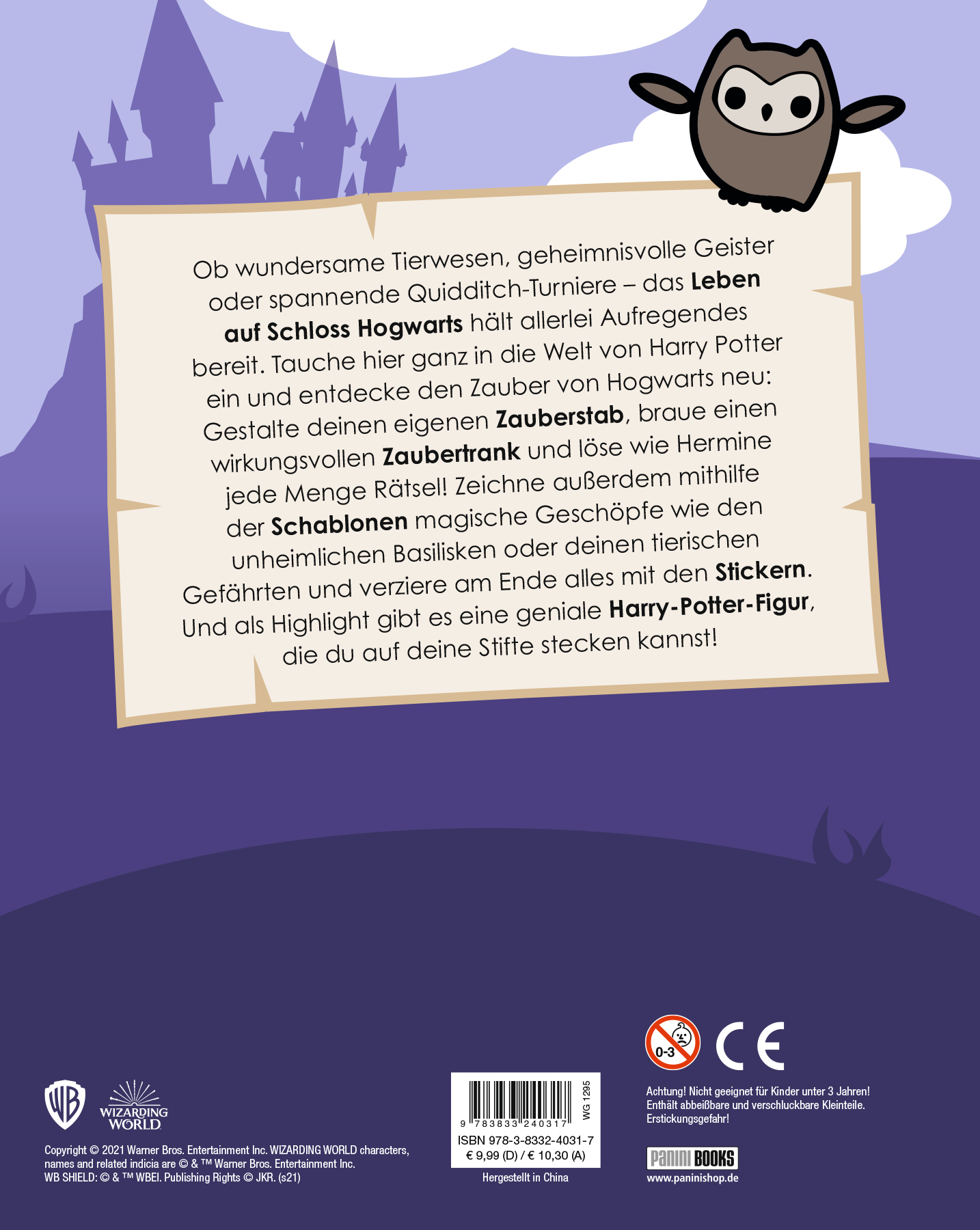 Ob wundersame Tierwesen, geheimnisvolle Geister oder spannende Quidditch-Turniere - das Leben auf Schloss Hogwarts hält allerlei Aufregendes bereit. Tauche hier ganz in die Welt von Harry Potter ein und entdecke den Zauber von Hogwarts neu: Gestalte deinen eigenen Zauberstab, braue einen wirkungsvollen Zaubertrank und löse wie Hermine jede Menge Rätsel! Zeichne außerdem mithilfe der Schablonen magische Geschöpfe wie den unheimlichen Basilisken oder deinen tierischen Stickern. Und als Highlight gibt es eine geniale Harry-Potter-Figur, die du auf deine Stifte stecken kannst!