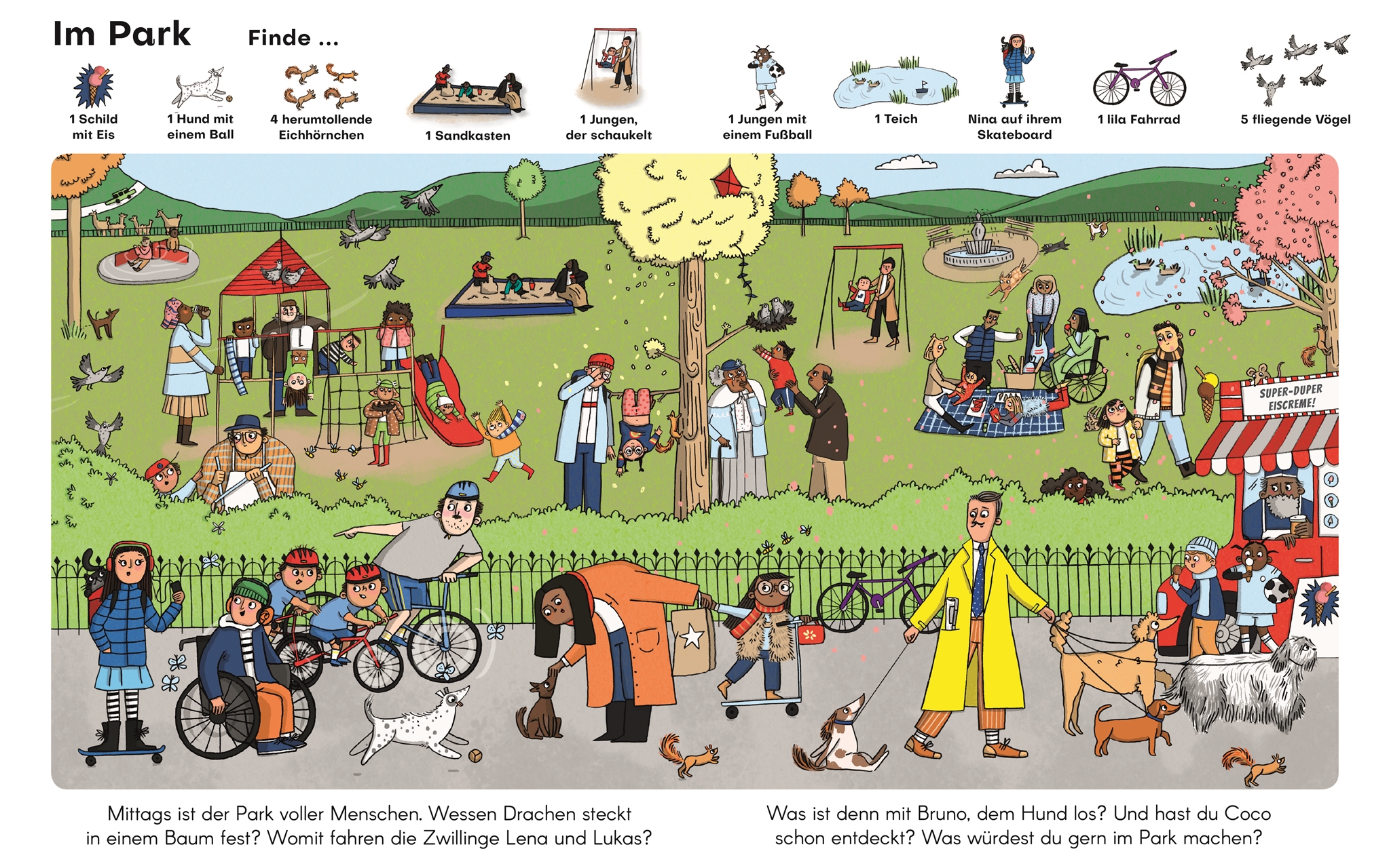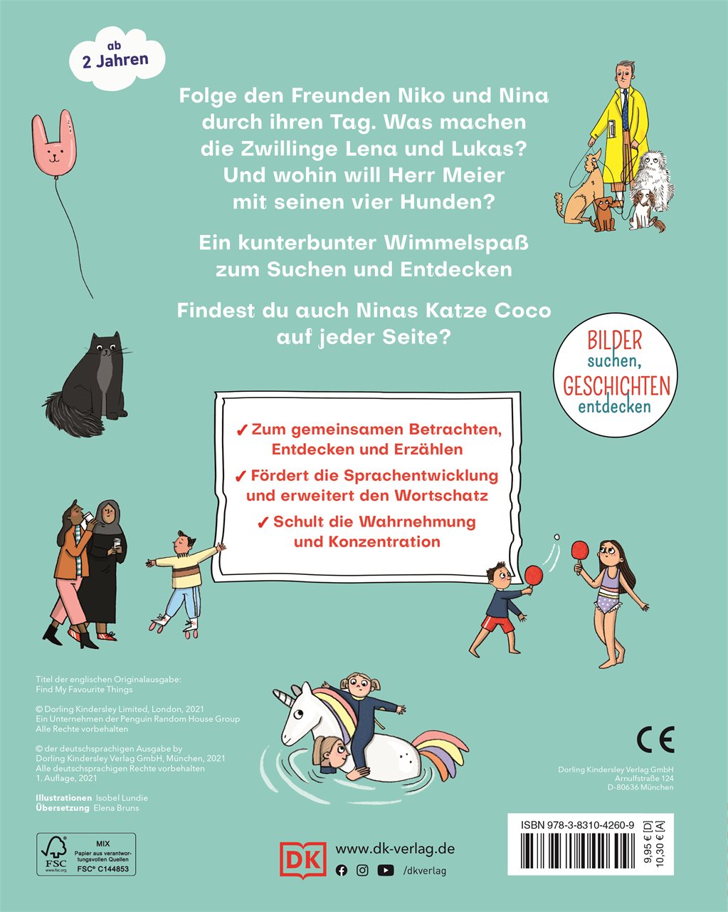 Ob Eis schleckende Kinder am Badesee, der enthusiastische Musiker auf dem Jahrmarkt und nicht zuletzt Coco, die niedliche Katze, die sich in jedem Bild versteckt hat. Es gibt sooo viel zu entdecken! Und ganz besonders viel Vergnügen macht dieses charmante Suchbuch für Kinder mit der ganzen Familie. 100% Such-, Erzähl- und Beschäftigungsspaß garantiert!