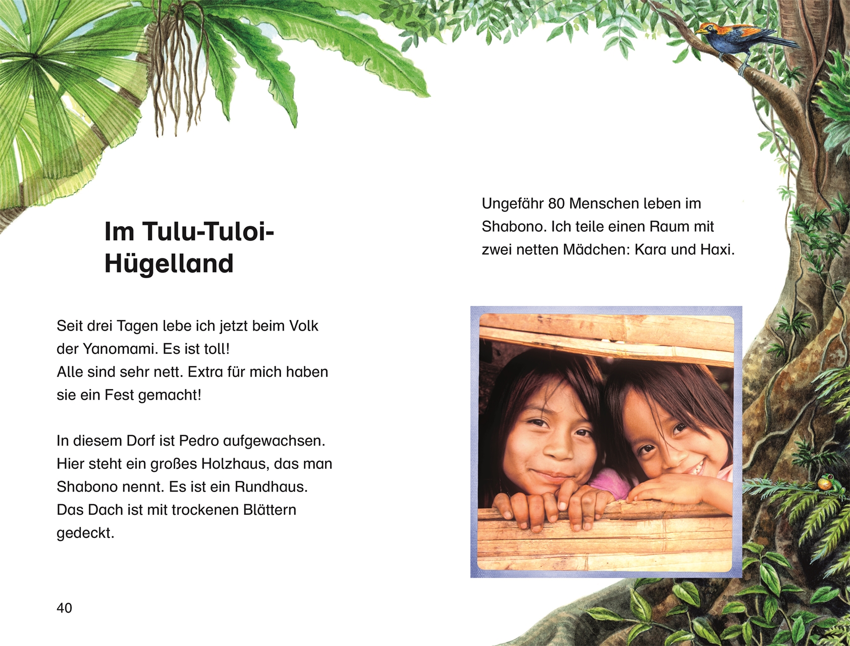 Dieses spannende Erstlesebuch nimmt Kinder mit auf eine Reise in den Amazonas und eignet sich mit Quiz und Lesebändchen perfekt zur Leseförderung. Aufregende Geschichten mit kurzen Kapiteln, einfachen Wörtern, klarer Gliederung, großer Fibelschrift und tollen Fotos werden durch interessante Hintergrundinformationen ergänzt: Was packe ich in meinen Koffer? , Welche Tierspuren gibt es? oder Wie häufig Regnet es im Urwald? . Mit der Kombination Sach-Wissen und abenteuerliche Geschichte macht das Lesen üben richtig Spaß!