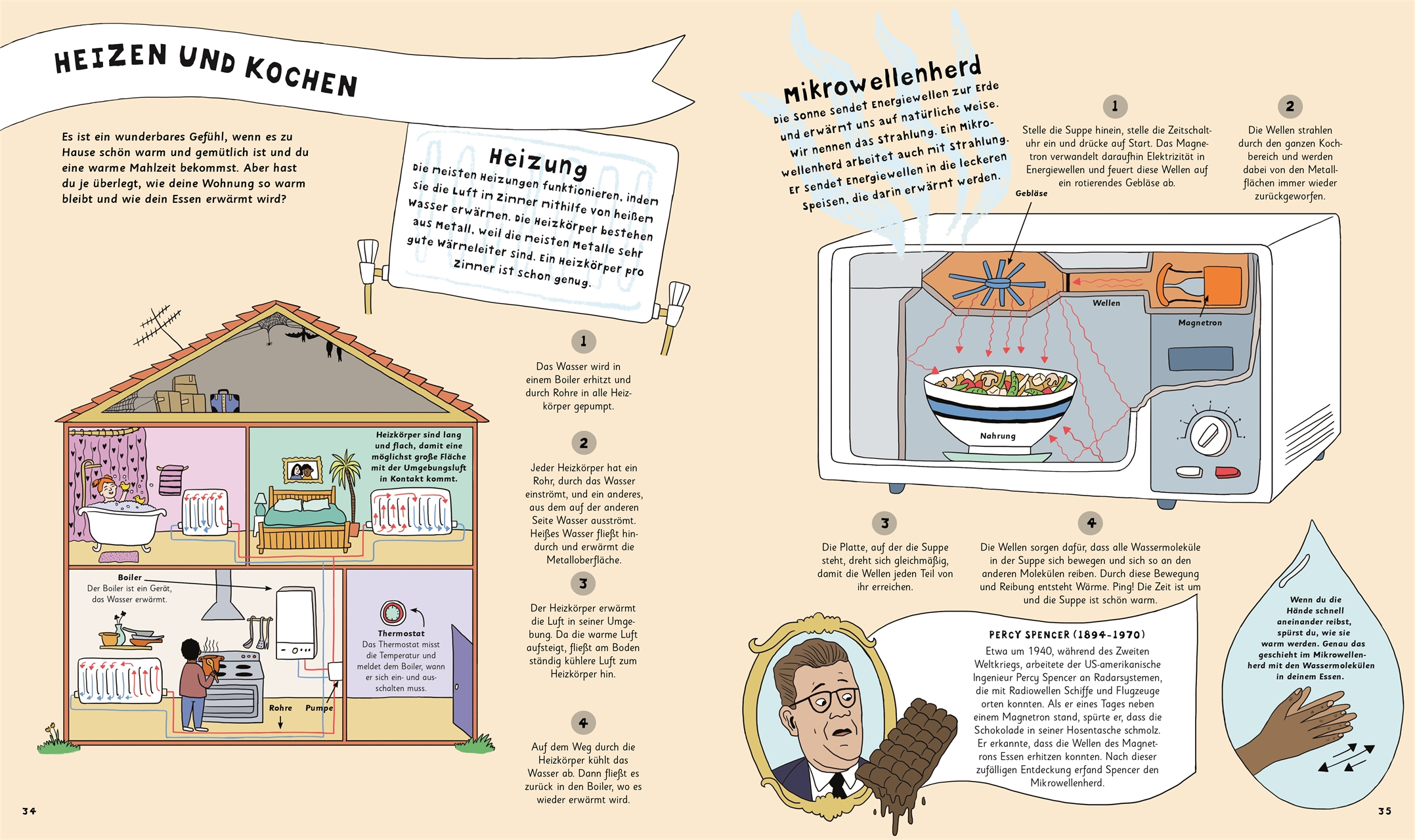 Die Funktionsweisen von Maschinen visualisiert: Wie kommt die Hitze in die Mikrowelle und was bringt die Rolltreppe ins Rollen? Spannende Doppelseiten mit farbenfrohen Illustrationen zeigen ausführlich kleine und größeren Maschinen und Geräte.