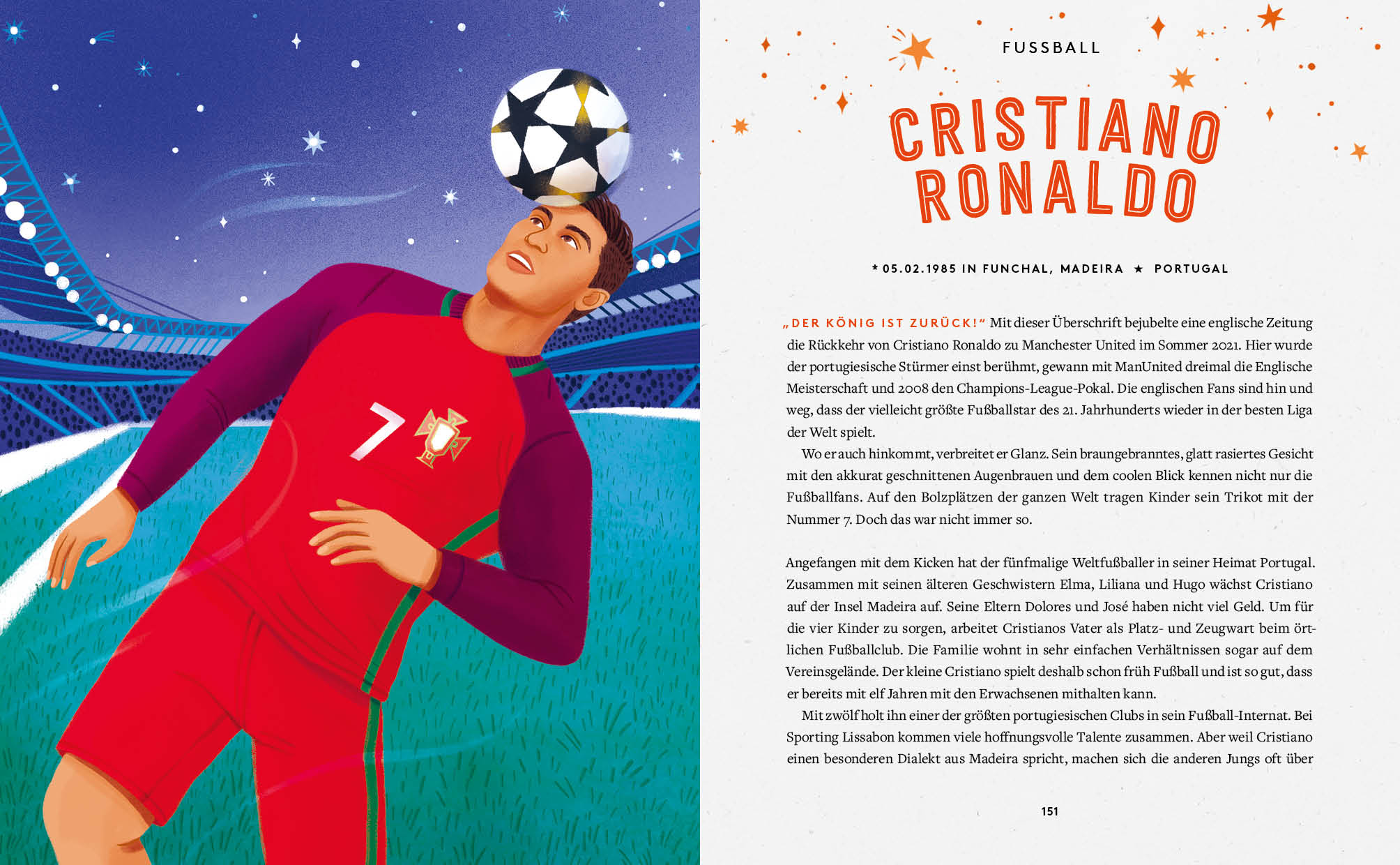 Sportbegeisterte jedes Alters kommen hier voll auf ihre Kosten: In 40 Geschichten erzählt Sven Voss bereichernde Lebensgeschichten von SportlerInnen mit besonderen Biografien. Von Basketball-Ikone Dirk Nowitzki und American Football Superstar Tom Brady über Tennis-Ausnahmeerscheinung Serena Williams und Biathlon-Star Laura Dahlmeier bis hin zur Fußballlegende Pele und Starcoach Jürgen Klopp sind alle dabei! Die Sportgeschichten dieser inspirierenden Persönlichkeiten sind nicht nur tolle Vorlesegeschichten, die Biografien ermutigen die kleinen Leser auch dazu, den Lieblingshelden nachzueifern.
